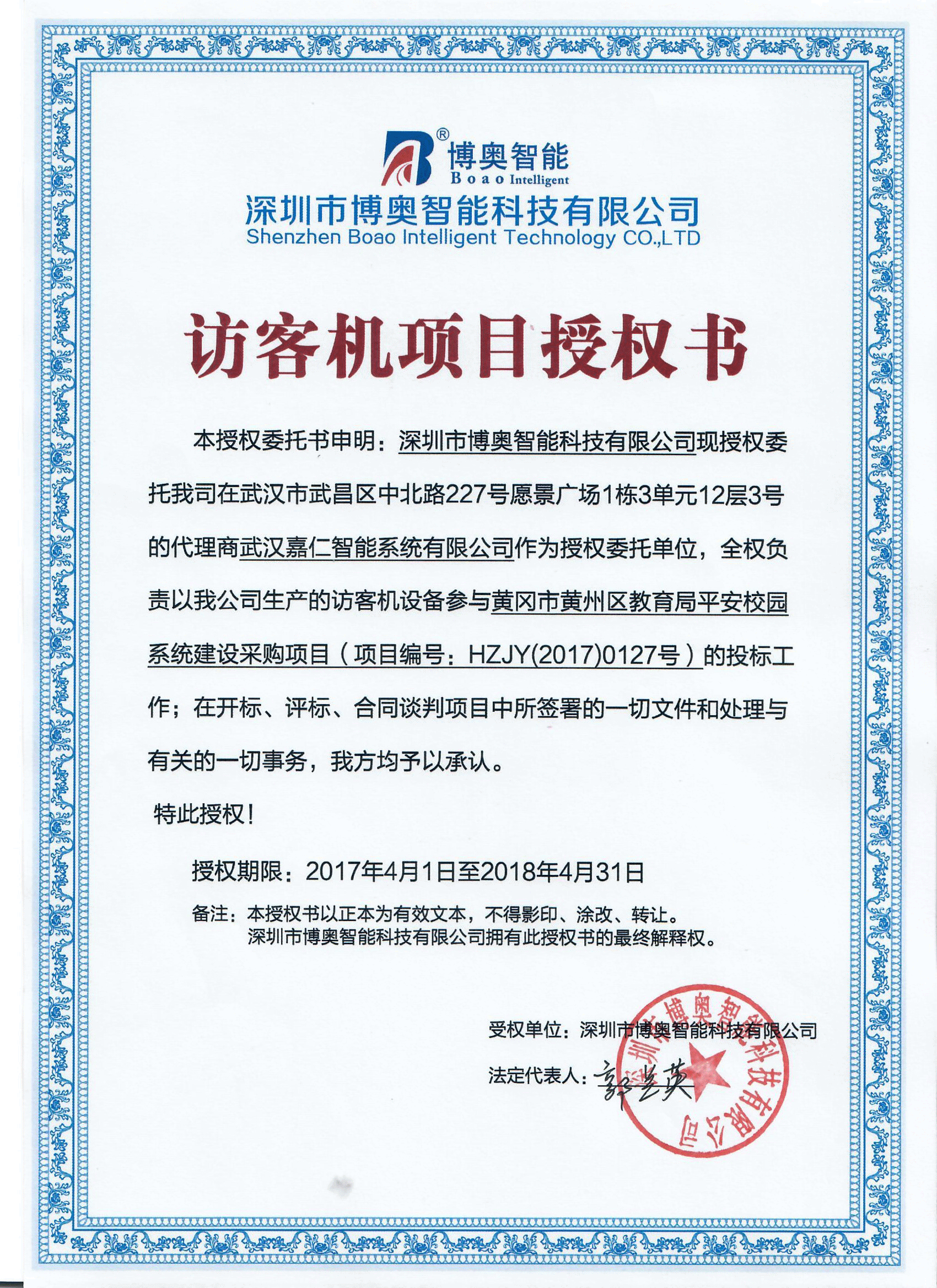 現(xiàn)授權(quán)我公司訪客機(jī)武漢代理商武漢嘉仁智能系統(tǒng)有限公司參與黃岡市黃州區(qū)教育局平安校園系統(tǒng)建設(shè)采購項(xiàng)目中的訪客登記管理系統(tǒng)投標(biāo)工作,訪客登記管理系統(tǒng)包含訪客機(jī)設(shè)備和訪客登記管理軟件。