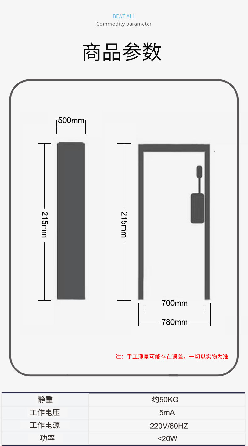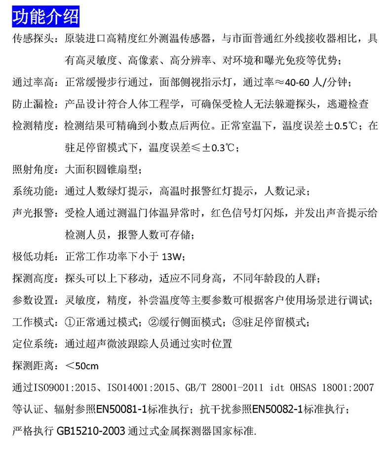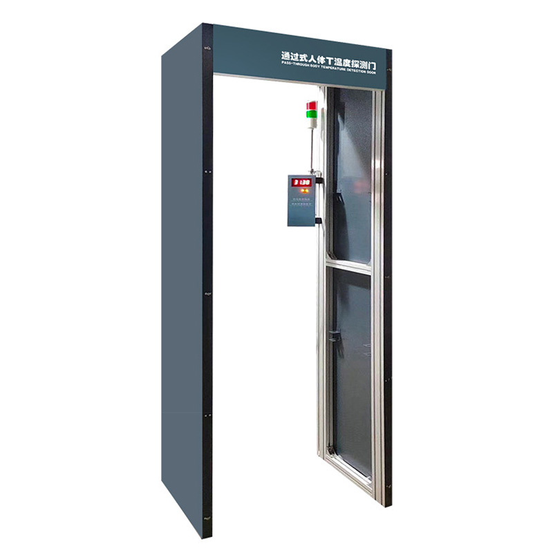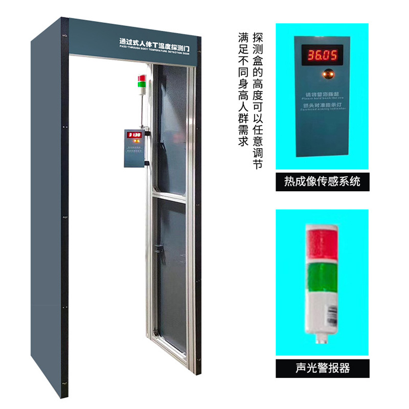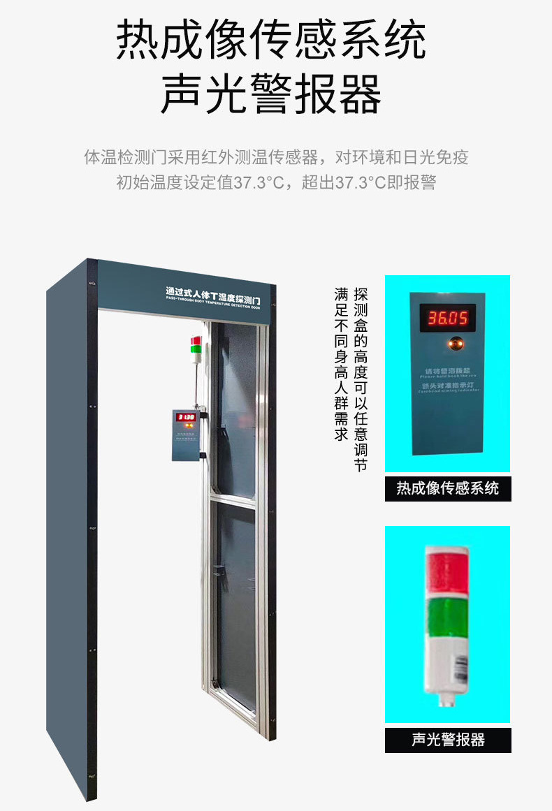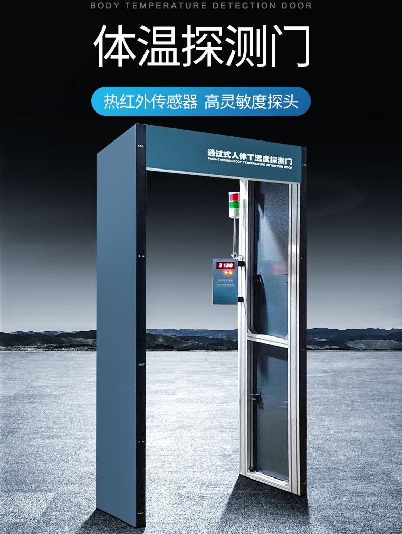 體溫檢測門采用高精度紅外測溫傳感器,感應距離可達0.5-1米,具有高精度和高分辨率,對環境和日光免疫。室溫下測量誤差±0.5℃,分辨率為0.02℃。初始溫度設定值為37.3℃(可調節),檢測門工作時顯示檢測出的人體實際體溫,超過37.3℃即報警,無人通過時顯示場地環境溫度。