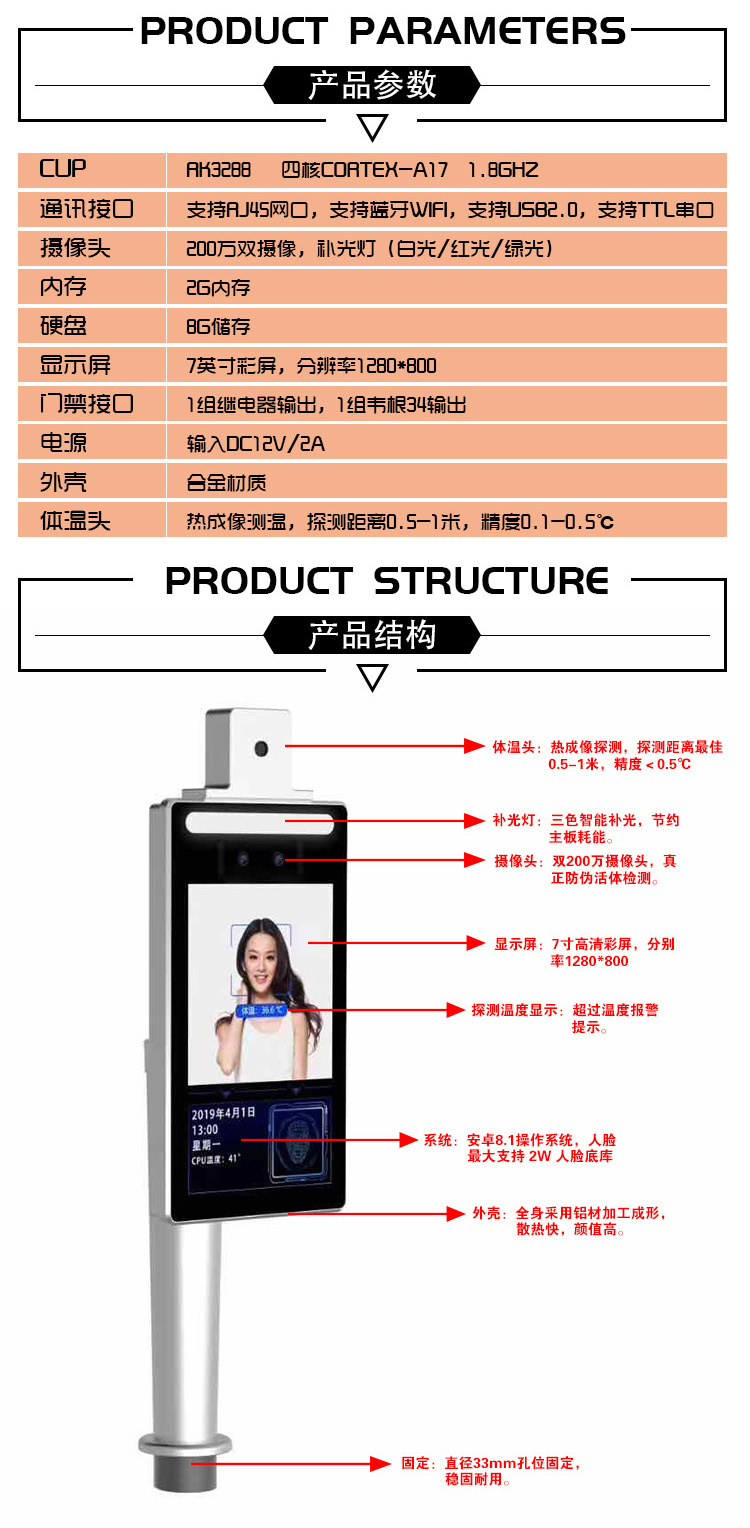 產品名稱:人臉識別自動測溫一體閘機聯動方案