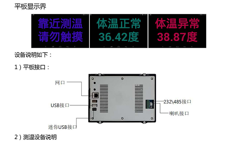 9. 可選支持人臉比對攝像機實現一人一檔,可選支持兩個開關量輸出,體溫正常一號輸出,體溫異常二號輸出;