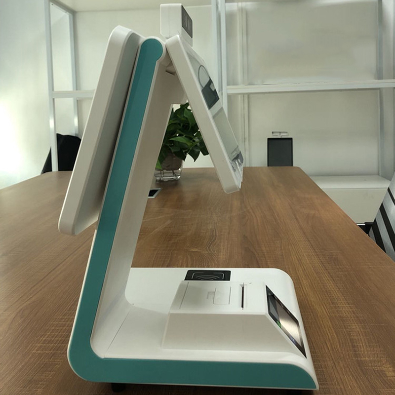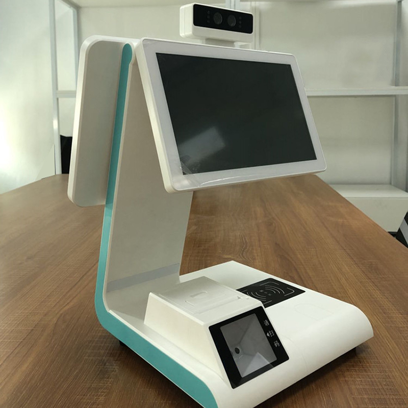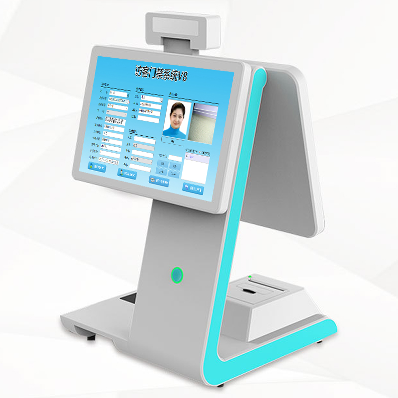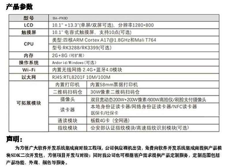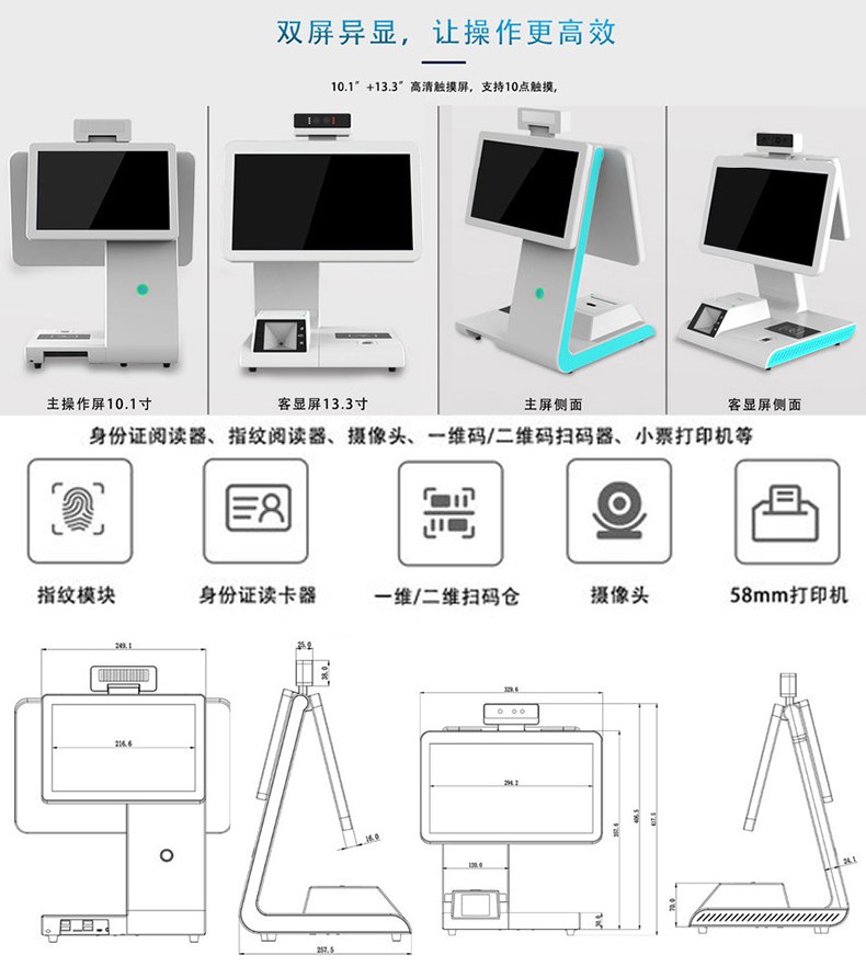 功能配置:主屏10.1寸 副屏13.3寸 身份證閱讀器 IC卡讀寫器 58mm熱敏打印機 條碼掃描儀 指紋(選配)