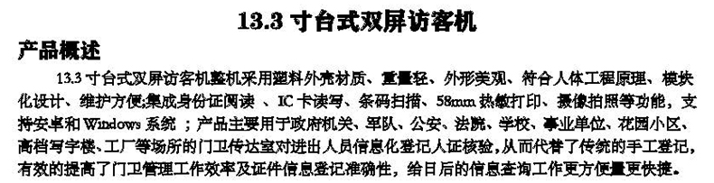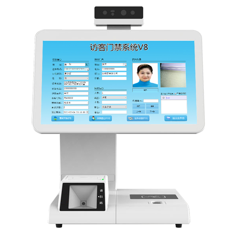 13.3寸臺式雙屏訪客機整機采用塑料外殼材質(zhì)、重量輕、外形美觀、符合人體工程原理、模塊化設(shè)計、維護方便;集成身份證閱讀 、IC卡讀寫、條碼掃描、58mm熱敏打印、攝像拍照等功能,支持安卓和Windows系統(tǒng) ;產(chǎn)品主要用于政府機關(guān)、軍隊、公安、法院、學校、事業(yè)單位、花園小區(qū)、高檔寫字樓、工廠等場所的門衛(wèi)傳達室對進出人員信息化登記人證核驗,從而代替了傳統(tǒng)的手工登記,有效的提高了門衛(wèi)管理工作效率及證件信息登記準確性,給日后的信息查詢工作更方便量更快捷。