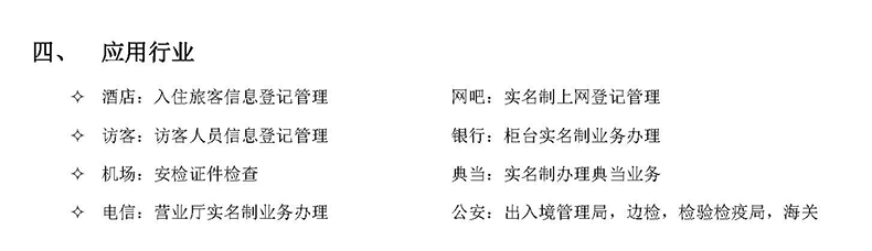 4) 識讀種證種類多而全:可識讀符合國際民航組織ICAO DOC 9303國際標準的電子護照、電子回鄉證、電子臺胞證等多種國內外的旅行證件;還可以識別身份證、駕駛證、行駛證、港澳通行證、臺灣通行證等幾十種身份證件;