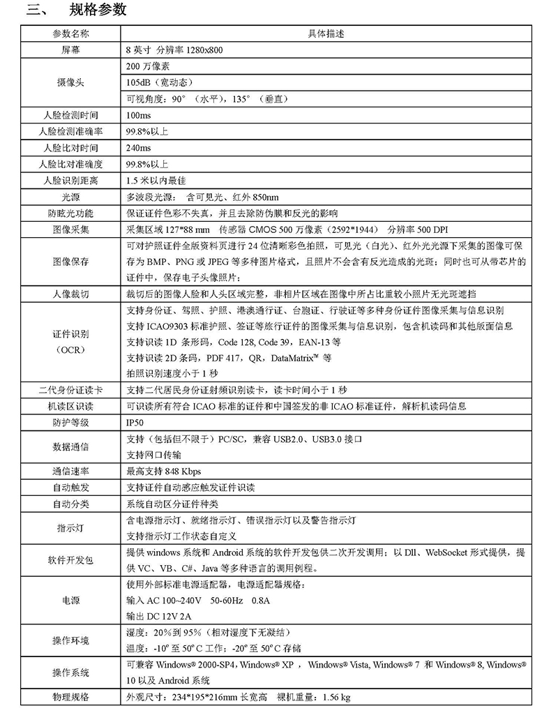 6) 高清拍攝,清晰視角:證件識別攝像頭500萬像素高清成像,物理分辨率達到500DPI;可見光采集圖像、紅外光識別;