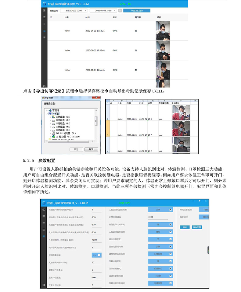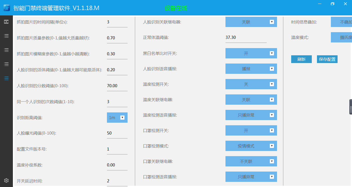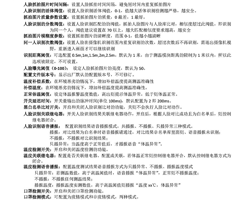 ???用戶可設置人臉抓拍的關鍵參數和開關設備功能。設備支持人臉識別比對、體溫檢測、口罩檢測三大功能,用戶可自由組合配置開關功能,是否關聯控制繼電器,是否播報語音提醒等。例如用戶要求體溫正常即可開門,則開啟體溫檢測功能,其余關閉即可實現;若用戶要求規定的人,體溫正常且佩戴口罩后才可以開門,則必須同時開啟人臉識別比對、體溫檢測、口罩檢測,當此三項全部檢測正常才會控制繼電器開門。配置界面和具體詳細如下所述。