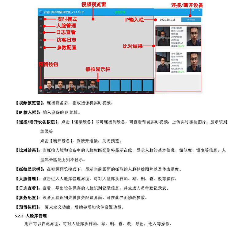 設備上電后,使用智能門禁管理軟件設置人臉庫、預覽實時視頻、顯示實時對比結果、讀取設備日志、配置設備參數等操作。