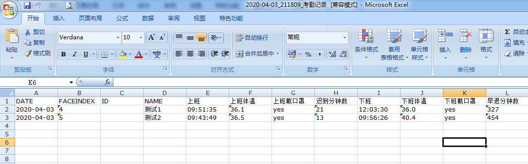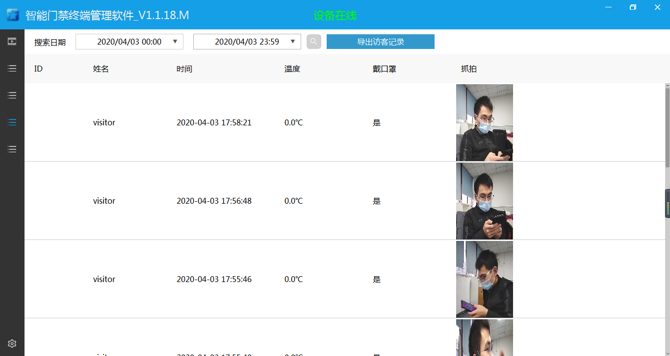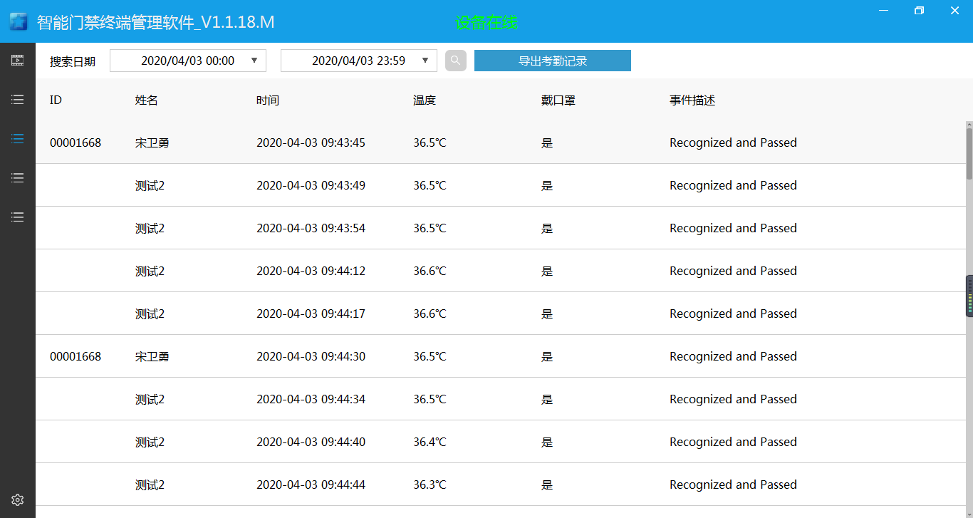 【日志查看】:查看、導出設備保存的人臉識別記錄信息,并生成人員考勤記錄表。