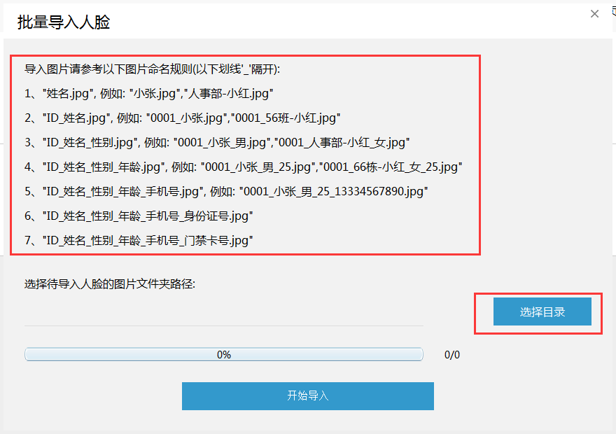 點擊【批量導入】,彈出界面è點擊【選擇目錄】,選擇人臉圖片文件夾è點擊【開始導入】,導入進度條完成即完成批量導入人臉操作。