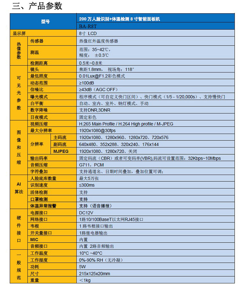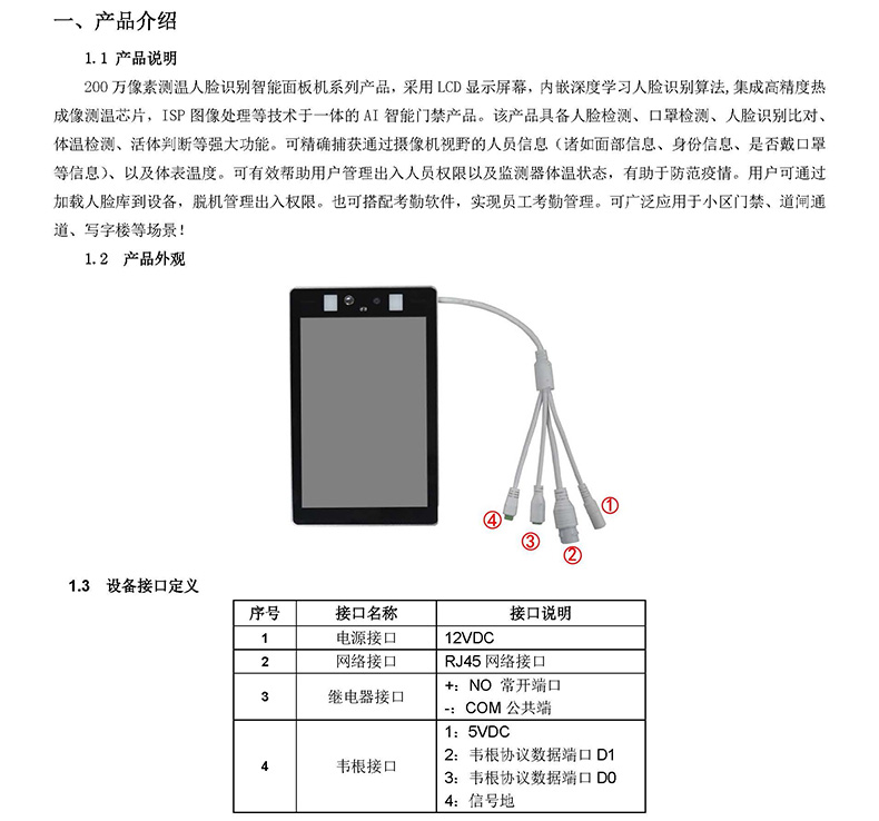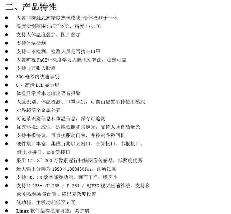 200萬像素測溫人臉識別智能面板機系列產品,采用LCD顯示屏幕,內嵌深度學習人臉識別算法,集成高精度熱成像測溫芯片,ISP圖像處理等技術于一體的AI智能門禁產品。該產品具備人臉檢測、口罩檢測、人臉識別比對、體溫檢測、活體判斷等強大功能。可精確捕獲通過攝像機視野的人員信息(諸如面部信息、身份信息、是否戴口罩等信息)、以及體表溫度。可有效幫助用戶管理出入人員權限以及監測器體溫狀態,有助于防范疫情。用戶可通過加載人臉庫到設備,脫機管理出入權限。也可搭配考勤軟件,實現員工考勤管理。可廣泛應用于小區門禁、道閘通道、寫字樓等場景!