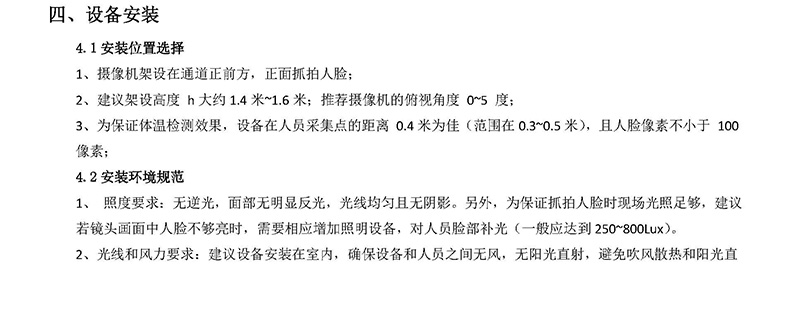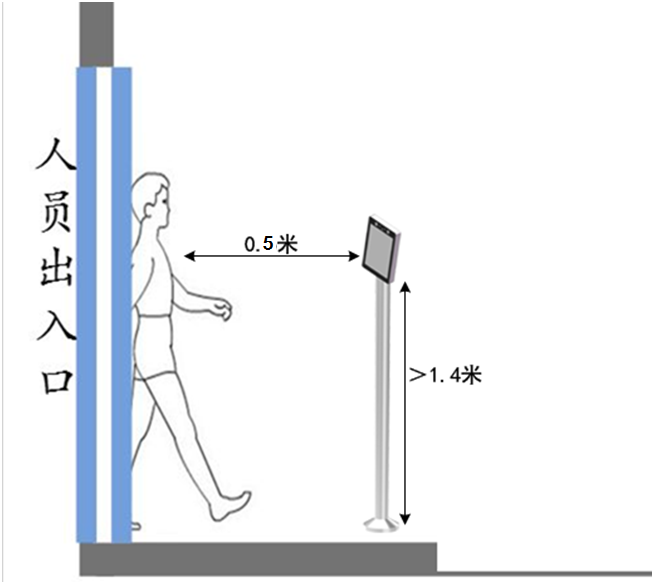 3、為保證體溫檢測效果,設備在人員采集點的距離 0.4米為佳(范圍在0.3~0.5米),且人臉像素不小于 100像素;