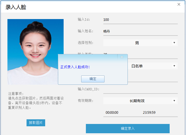 ?點擊【添加】按鈕,進入界面è人臉正對攝像頭è點擊【抓取圖片】按鈕,抓取人臉圖片è輸入人員資料,點擊【確定錄入】按鈕è提示正式錄入人臉成功完成。