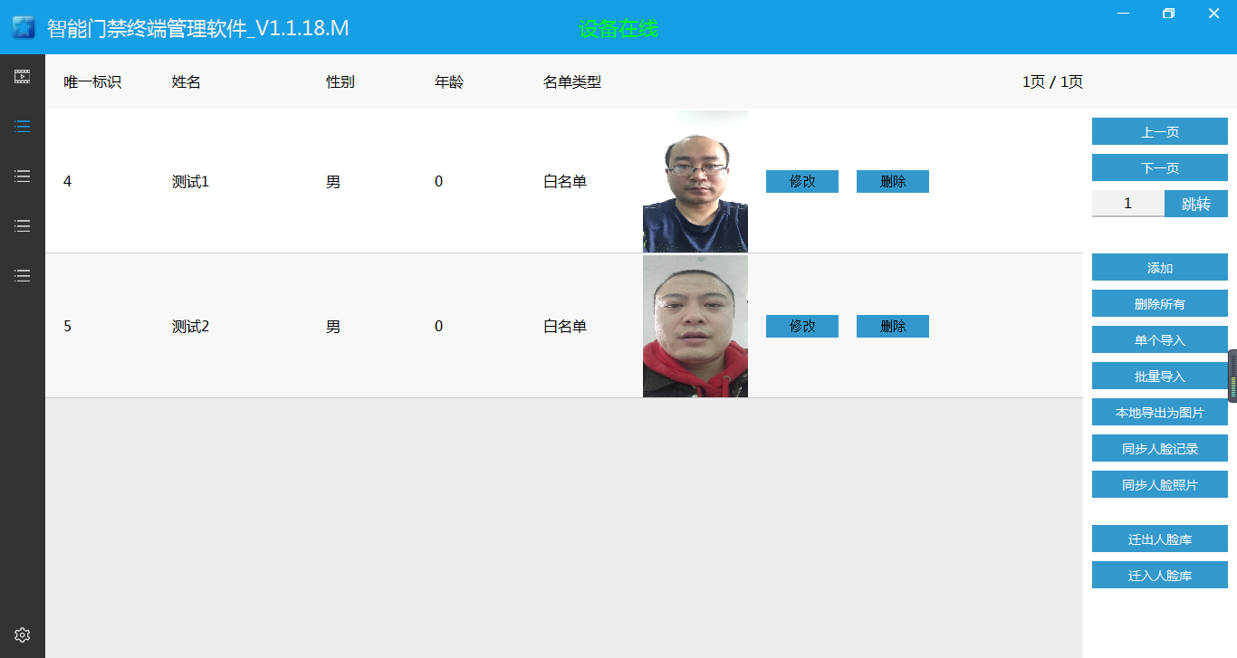 ??? 用戶可以在此界面,可對人臉庫執行加、減、刪、查、改,導出,遷入等操作。