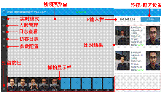 【抓拍顯示欄】:在視頻預覽模式下,顯示當前畫面的抓取的人臉抓拍圖片以及體表溫度。