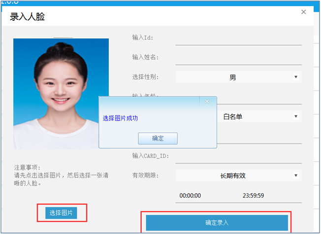 點擊【單個導入】,彈出錄入人臉界面è點擊【選擇圖片】,選取人臉圖片文件è輸入人員信息è點擊【確定錄入】即可完成單個人臉導入。