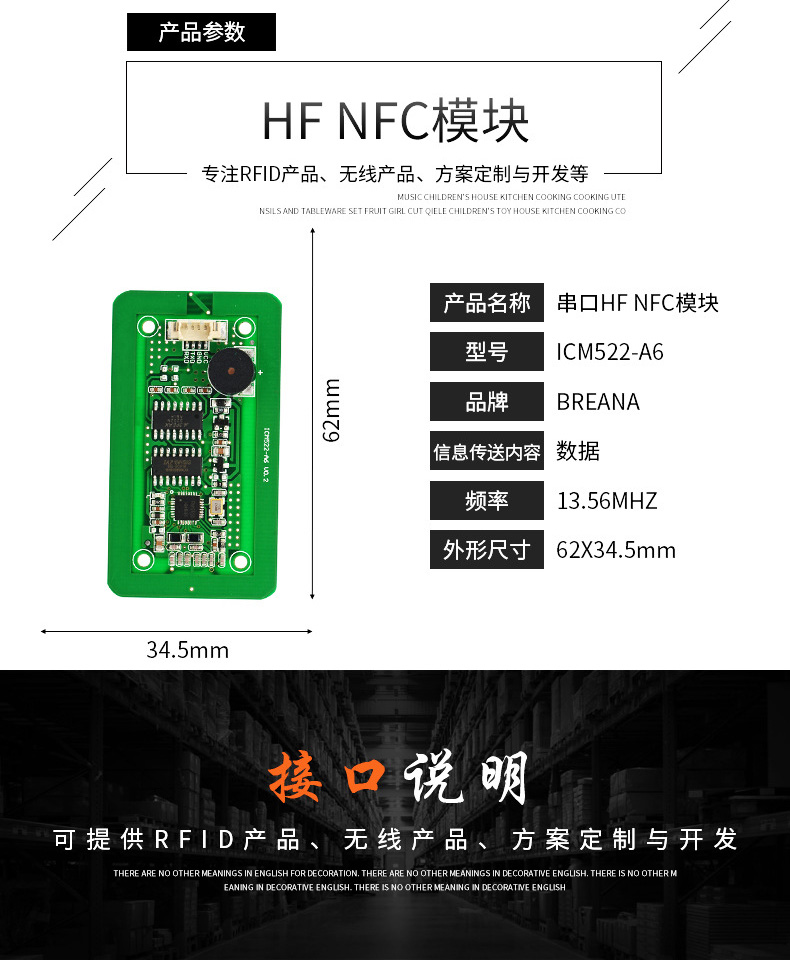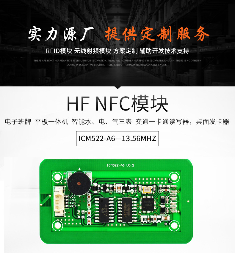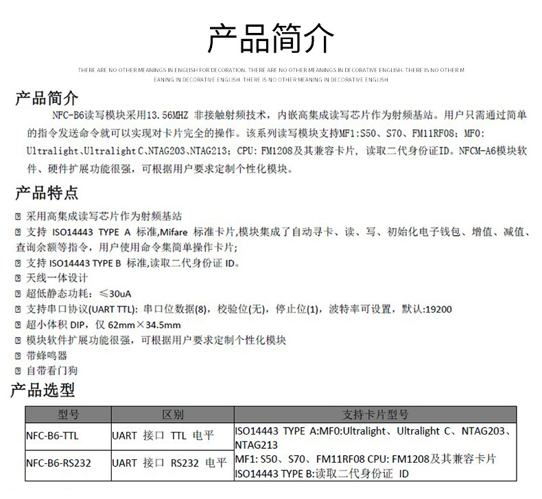 NFC-B6讀寫模塊采用13.56MHZ 非接觸射頻技術,內嵌高集成讀寫芯片作為射頻基站。用戶只需通過簡單的指令發送命令就可以實現對卡片完全的操作。該系列讀寫模塊支持MF1:S50、S70、FM11RF08;MF0: Ultralight、Ultralight C、NTAG203、NTAG213;CPU: FM1208及其兼容卡片, 讀取二代身份證ID。NFCM-A6模塊軟件、硬件擴展功能很強,可根據用戶要求定制個性化模塊。