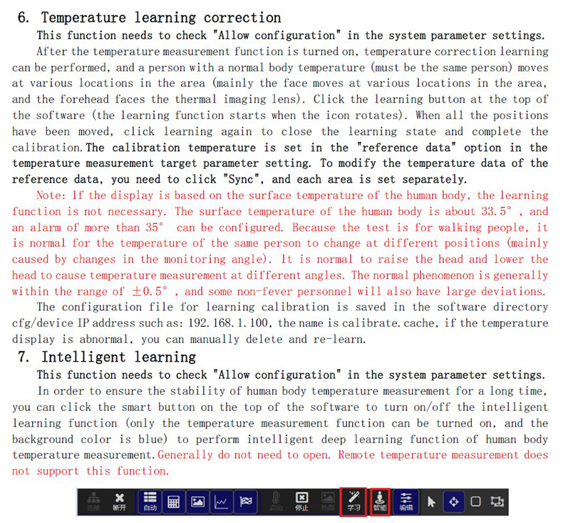 為了保證長時間人體測溫的穩定性,可以點擊軟件上方智能按鈕開啟/關閉智能學習功能(只有啟動測溫功能才能開啟,底色為藍色為開啟),進行人體測溫智能深度學習功能。一般不需要開啟。遠端測溫不支持此功能。