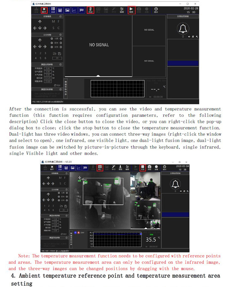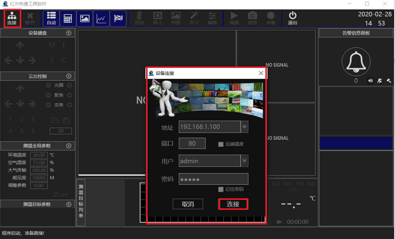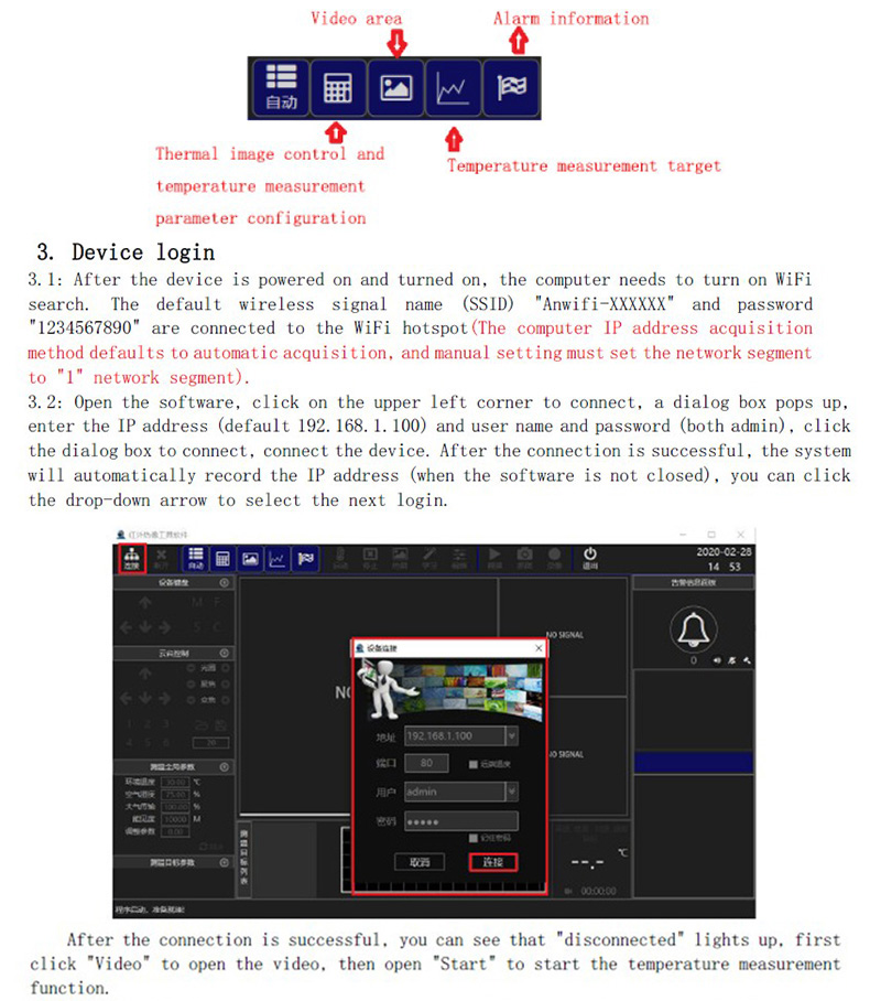 安裝好設備后,接通電源給設備上電,設備使用DC12V電源,用網絡和電腦連接,如果設備帶前端測溫功能(參數配置還需要測溫軟件配置),則可以連接到監視器監控。在電腦上打開測溫軟件,連接設備,默認IP地址為192.168.1.100。注意電腦IP地址需要在同一個網段。