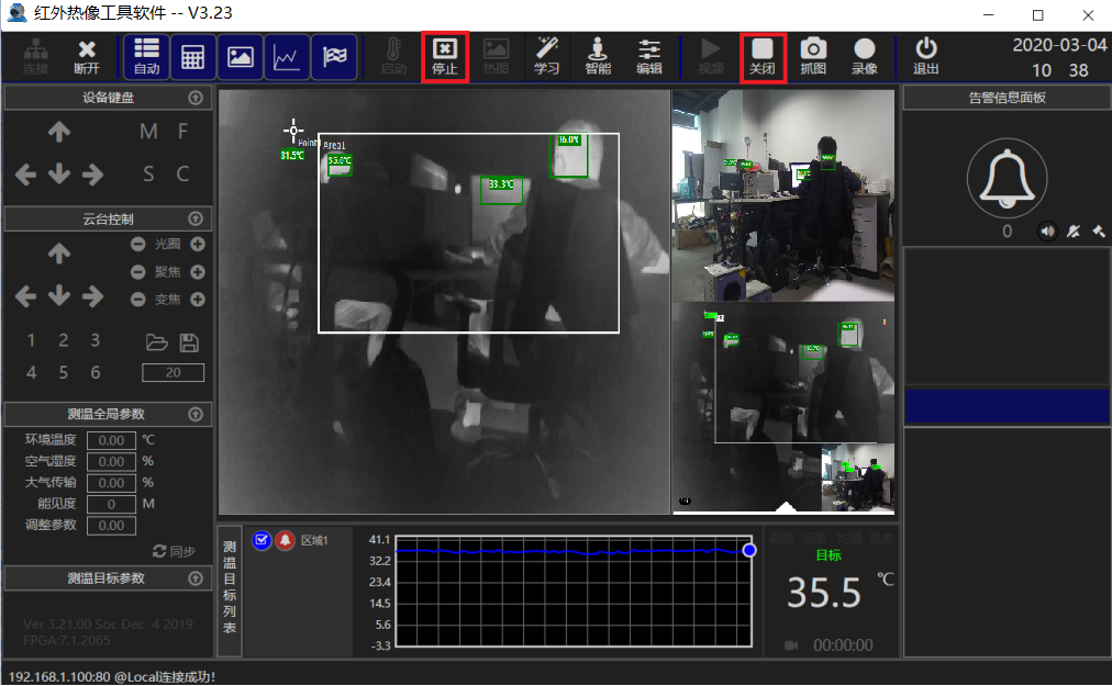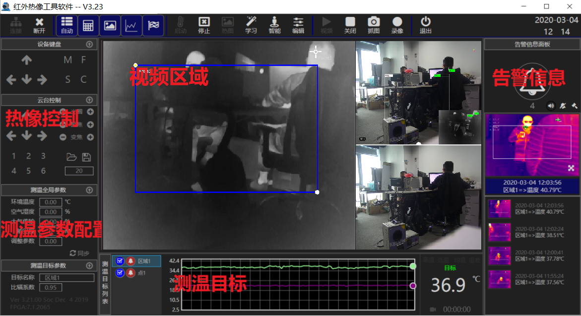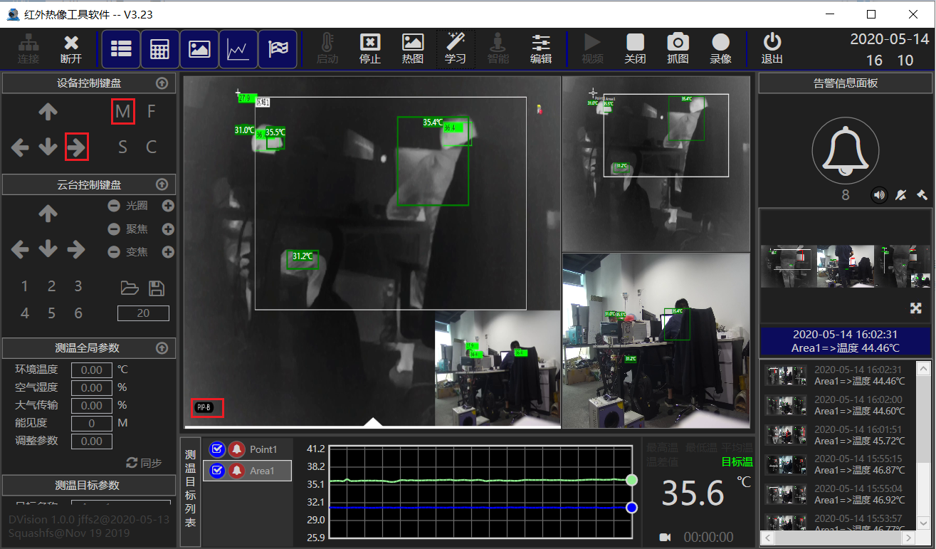 設置好區域及參數,就可以開始測試,查看設置區域人員測溫是否準確,是否誤報,如有溫度顯示不正常,可重新學習校正。檢查環境是否有干擾源,如取暖設備;如果正常,就可以開始監控使用,如檢測到人員超溫,系統會告警后抓圖,圖片可以軟件右邊區域查看。報警人員需通過體溫計再次測試確認。