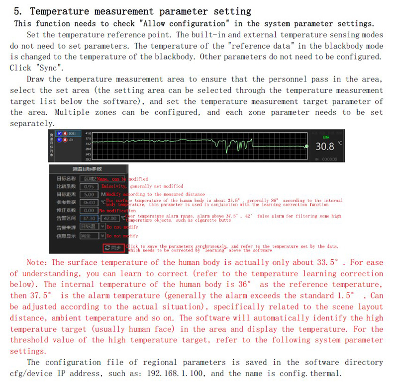 注:人體表面溫度實際只有33.5°左右,為了便于理解,可以通過學習校正(參考下面溫度學習校正)人體體內溫度36°為基準溫,那么按37.5°為報警溫度(一般按超過標準1.5°報警,可根據實際情況調整),具體和場景布置距離,環境溫度等有關。軟件會自動標識區域內的高溫目標(一般是人臉)并顯示溫度,抓取高溫目標的門限值參考下面系統參數設置。