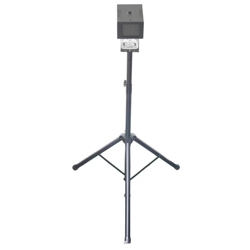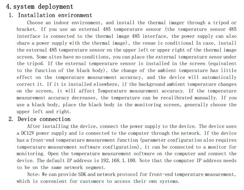 選擇一個室內壞境,通過三腳架或支架固定安裝熱像儀,如果使用外置485溫感(溫感485接口和熱像的485接口連接,供電也可以和熱像共用一個電源),場地有條件情況下,把外置485溫感安裝在熱像畫面的左上方或右上方。有些場地沒有條件,可以把外置溫感放置在三角架下。如果外置溫感安裝在畫面中(等同于黑體的作用),環境溫度的變化對測溫精度度影響很小,設備會自動校正,如果安裝在別處,畫面中背景環境溫度變化的話,會影響測溫精度,如果測溫精度下降,可手動重新校正溫度。如果使用黑體,把黑體放置在監控畫面中,一般選左右上方。