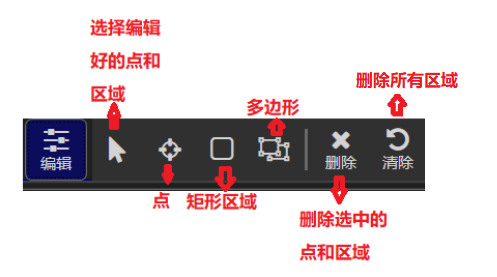 點擊上方編輯,編輯熱像畫面的點和區域(再次點擊編輯退出編輯),如下圖,可以編輯三種圖形,點、矩形和多邊形,選擇需要編輯的圖形,鼠標左鍵在畫面中編輯即可,多邊形最后兩點通過雙擊左鍵可以自動連接。通過選中點或區域名稱,可以拖動點或區域位置,選中后也可通過刪除按鈕刪除點或區域。