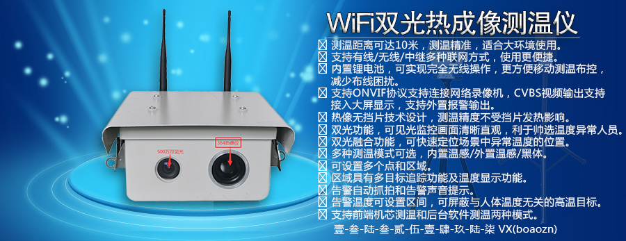 無線雙光融合人體高精度測溫儀,具有雙光融合功能,可快速準確地分辨溫度異常人員,可輸出無線/有線網絡信號,配合后臺PC測溫軟件,可實現非接觸快速大流量人體溫度異常篩選功能,采用最新智能測溫模型,無擋片成像方式,可以連續不間斷對目標人群進行溫度檢測,測溫精度可達±0.3°(配置黑體可達±0.1°-0.3°)。