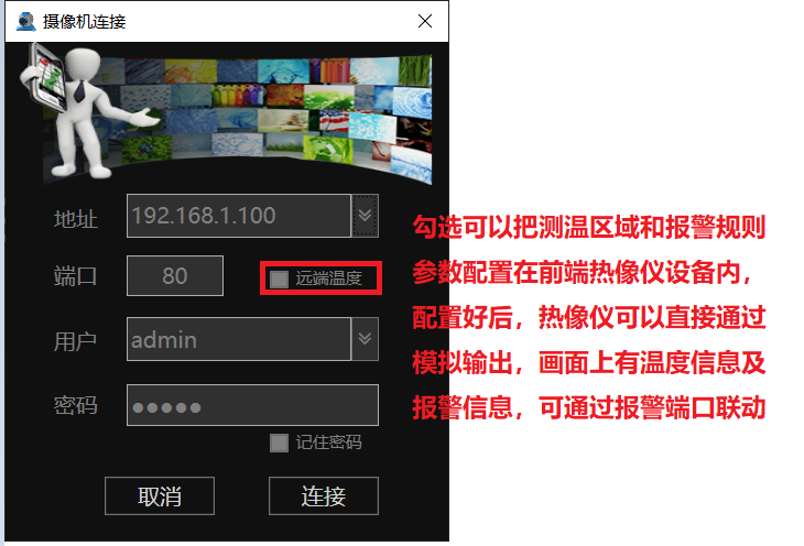 本軟件支持接入具有前端測溫功能的我司熱像產品,登入設備的時候勾選遠端測溫即可(需要前端熱像儀支持此功能),設置方法參考上面說明,配置成功后熱像可以通過模擬輸出連接監視器監控測溫,監控畫面可顯示配置的區域及目標溫度。產生告警,畫面右上角會有報警圖標,報警信號也可以通過熱像報警輸出口外接報警設備。