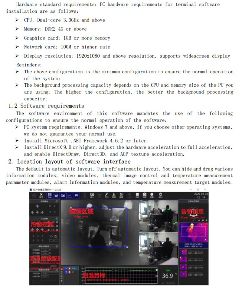 博奧智能熱像儀通過網絡連接PC,PC端安裝軟件,該軟件可以連接熱像視頻,可以顯示最高溫,中心點溫度;可以設置區域,自動追蹤人員并顯示溫度,可配置超溫報警,實現報警抓拍功能,支持通過AV視頻接口連接大屏顯示器。