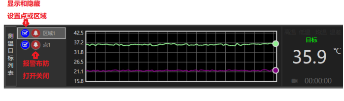 軟件具有告警布防功能,默認打開,在軟件下方測溫目標列表,可以配置設置的區域的布防開關,還可以顯示和隱藏熱像視頻中設置的測溫點和區域。選中某個區域,下方可顯示該區域的最高溫及統計曲線。