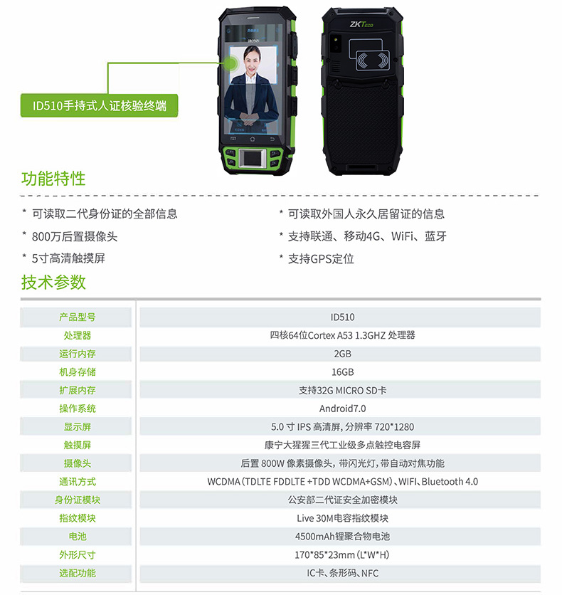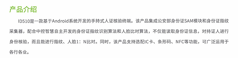 博奧智能ID510是—款基于Android系統開發的手持式人證核驗終端。該產品集成公安部身份證SAM模塊和身份證指紋采集器,配合中控智慧自主開發的身份證指紋識別算法和人臉比對算法,不僅能讀取身份證信息,對持證人進行身份核驗,而且能進行指紋、人臉1: N比對。同時該產品支持選配IC卡、條形碼、NFC等功能,可廣泛運用于各行各業。