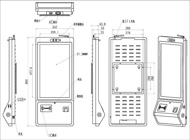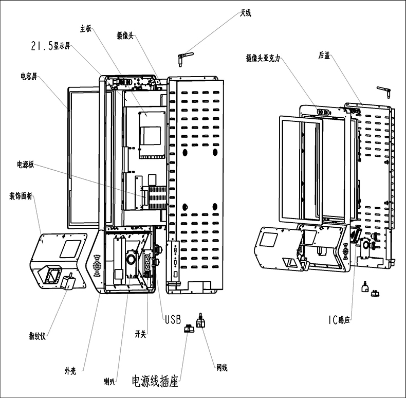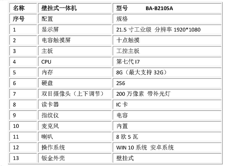 ? ?? ? BA-B2105A多功能壁掛式觸摸一體機支持WIN系統和安卓系統,模塊化設計,結構合理;主要集成21.5寸高分辨率顯示屏、防爆多點電容觸摸、寬動態高清雙目攝像頭、IC卡讀寫器、指紋儀,并且根據功能需求可配置身份證閱讀器、熱敏小票打印機、條碼掃描儀等配件;?外殼采購鈑金材質,結實牢固;表面采用烤漆工藝,外觀精美實用,搭配各類軟件可適用于多種場合,比如酒店自助入助登記終端,商場自助收銀終端,高檔小區門衛寫字樓大廳前臺用于來訪人員登記管理終端等。