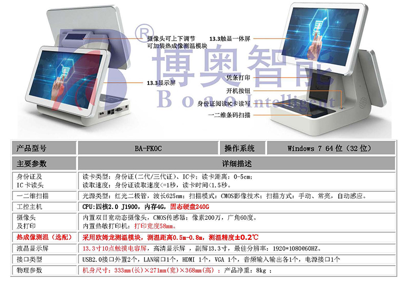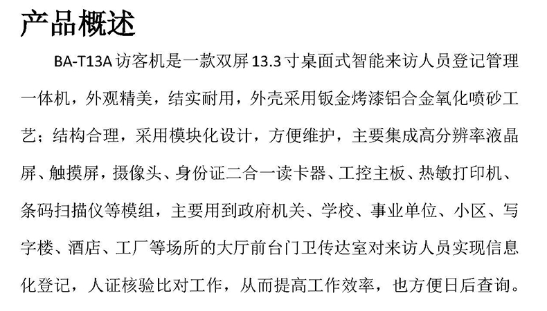 ?????? BA-T13A訪客機(jī)是一款雙屏13.3寸桌面式智能來(lái)訪人員登記管理一體機(jī),外觀精美,結(jié)實(shí)耐用,外殼采用鈑金烤漆鋁合金氧化噴砂工藝;結(jié)構(gòu)合理,采用模塊化設(shè)計(jì),方便維護(hù),主要集成高分辨率液晶屏、觸摸屏,攝像頭、身份證二合一讀卡器、工控主板、熱敏打印機(jī)、條碼掃描儀等模組,主要用到政府機(jī)關(guān)、學(xué)校、事業(yè)單位、小區(qū)、寫字樓、酒店、工廠等場(chǎng)所的大廳前臺(tái)門衛(wèi)傳達(dá)室對(duì)來(lái)訪人員實(shí)現(xiàn)信息化登記,人證核驗(yàn)比對(duì)工作,從而提高工作效率,也方便日后查詢。