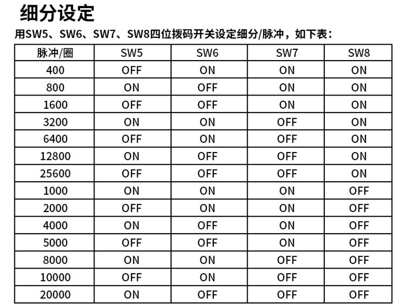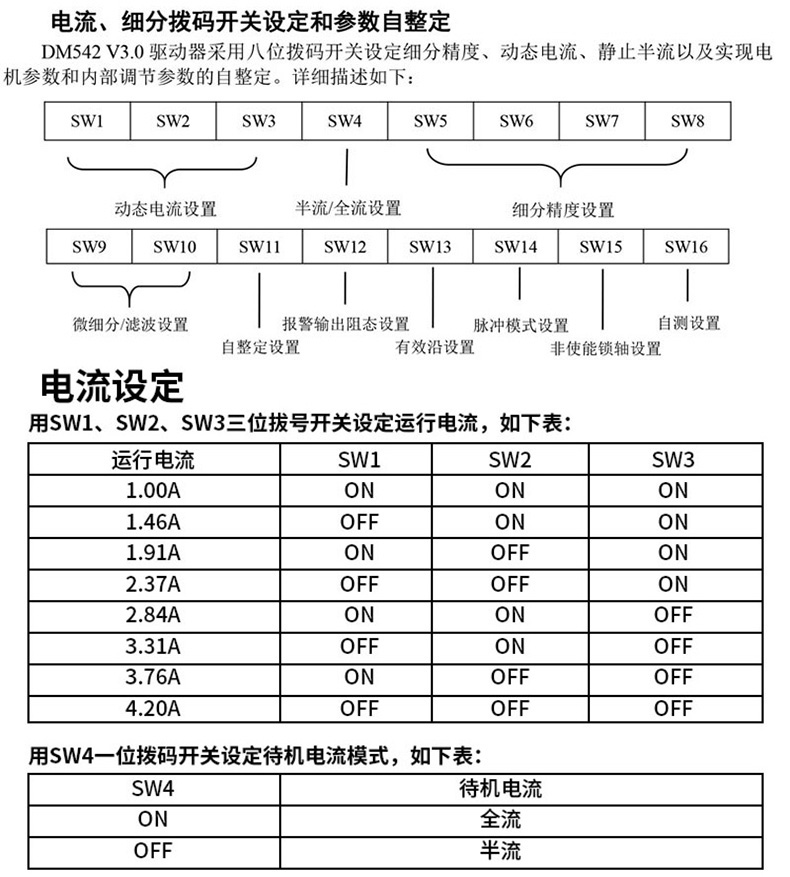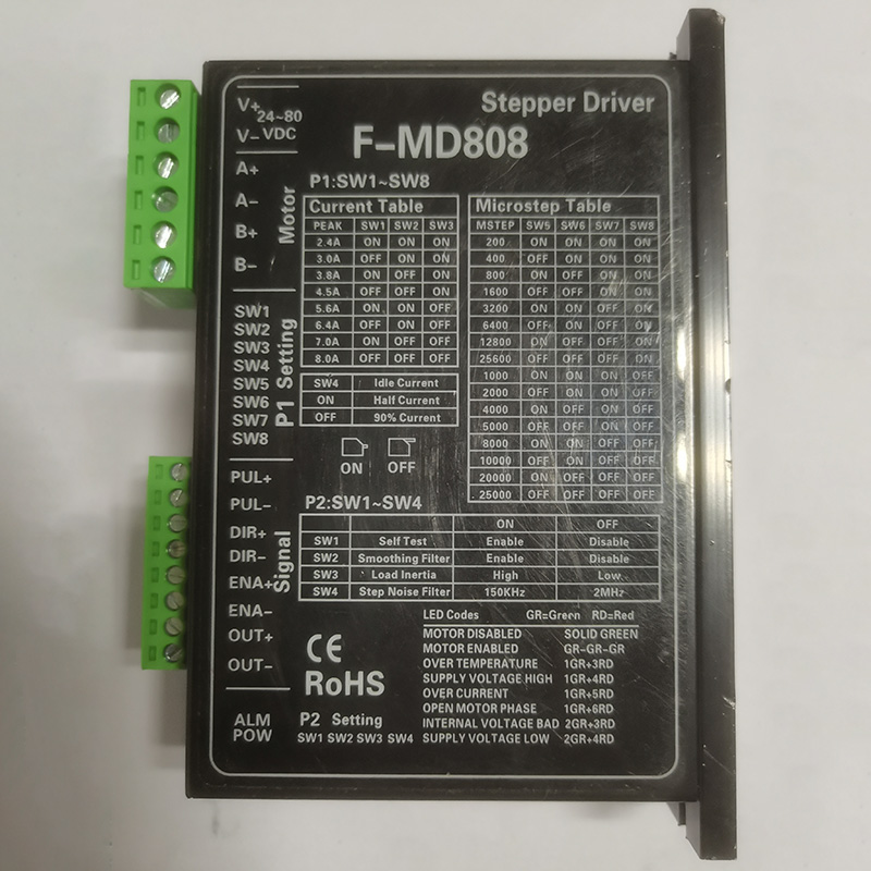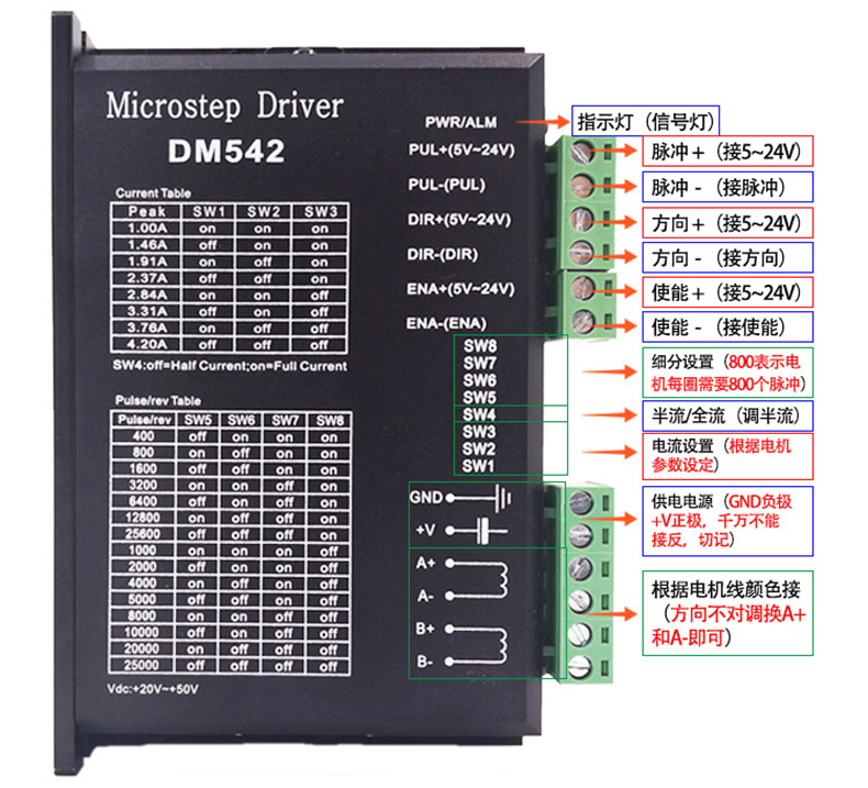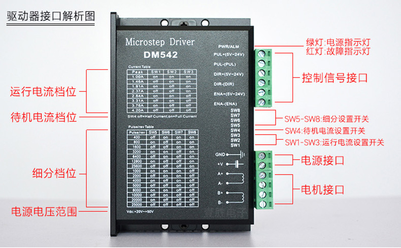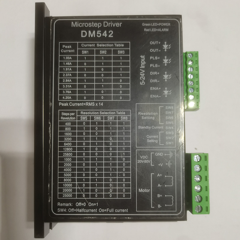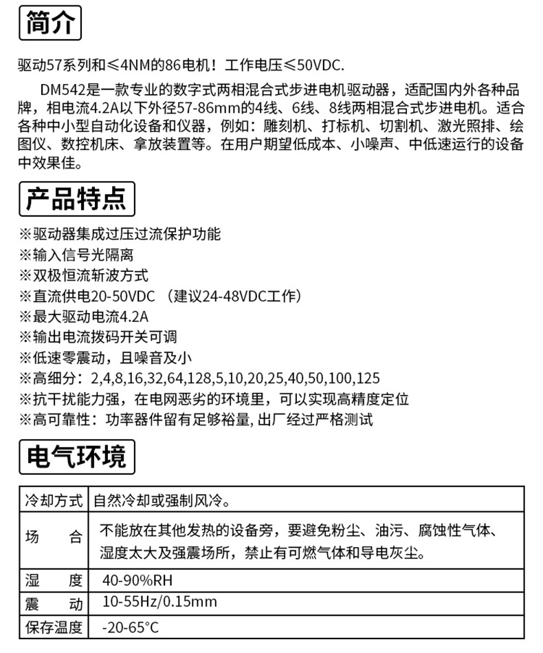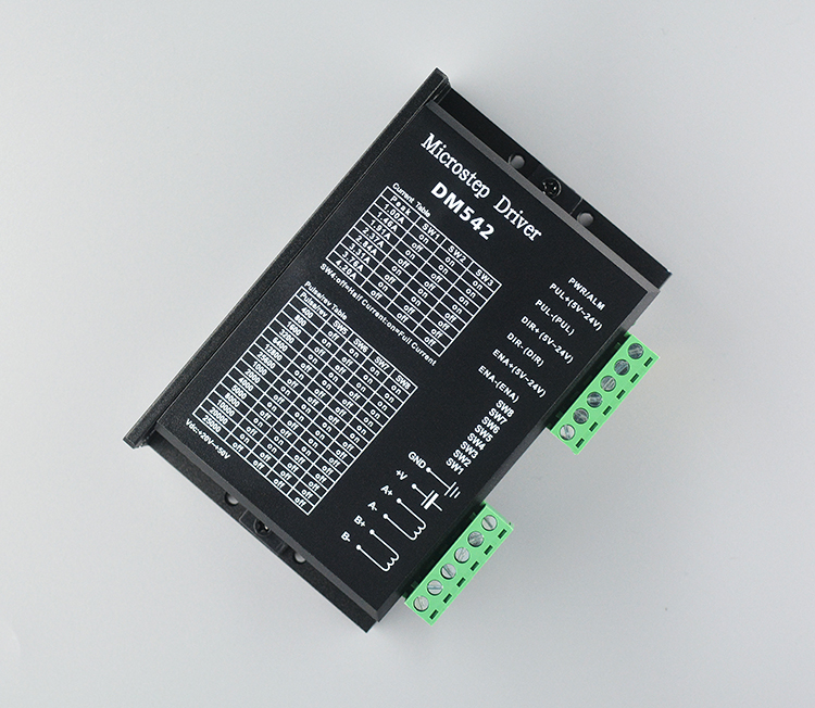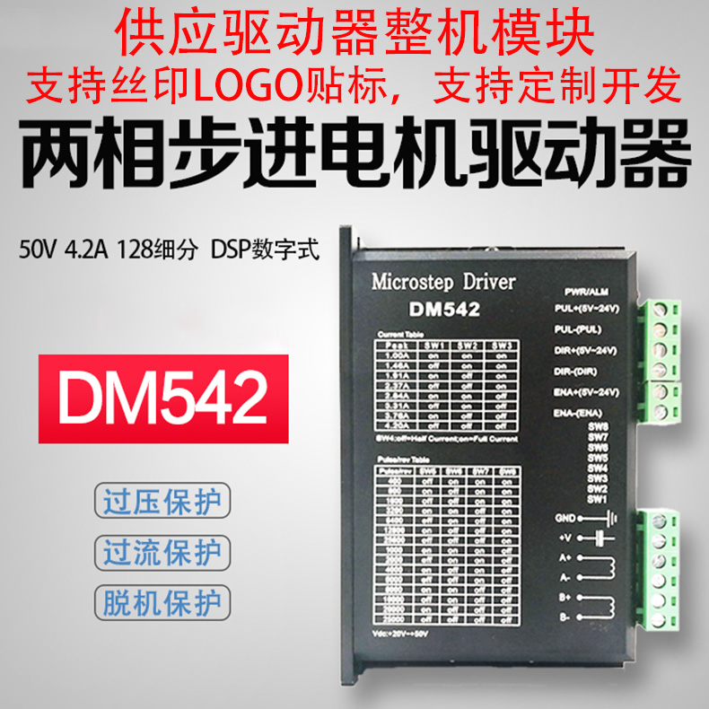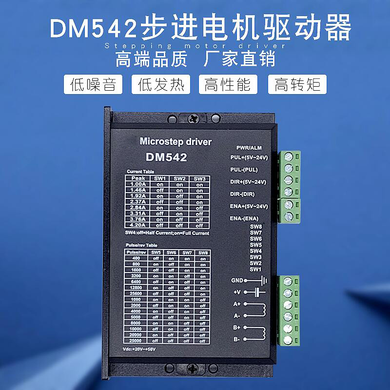 DM542 DSP 控制的數(shù)字式兩相混合式步進電機驅(qū)動器,適配相電流在 4.2A 以下、外徑 39,42,57,60,86mm 的四線,六線,八線兩相混合式步進電機。可設置128 內(nèi)各種細分以及 4.2A 內(nèi)各種電流,內(nèi)部增加電機專用控制算法,能夠針對不同電機采用相應運行參數(shù),使電機運行非常平穩(wěn),震動以及噪聲極小。 內(nèi)置過熱,過流,過壓檢測,保護驅(qū)動器穩(wěn)定運行。