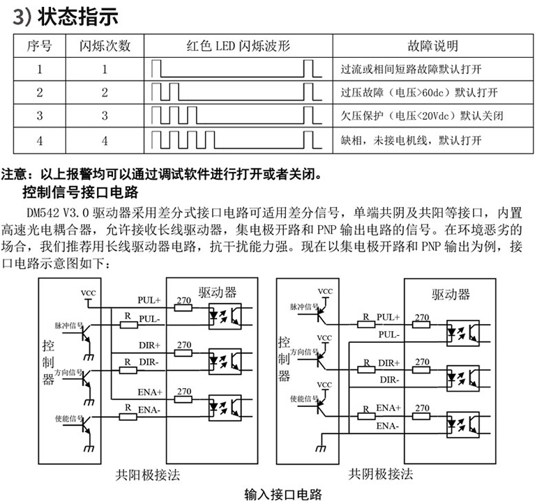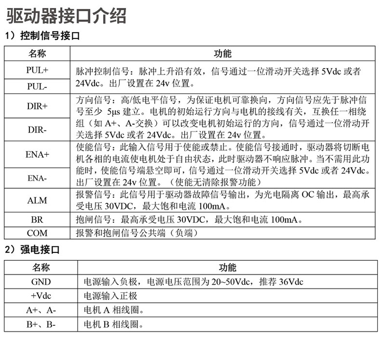 使能控制信號 此輸入信號用于使能或禁止驅(qū)動器輸出。ENA 接低電平(或內(nèi)部光耦導通)時,驅(qū)動器將切斷電機各相的電流使電機處于自由狀態(tài), 不響應步進脈沖。當不需用此功能時,使能信號端懸空即可。5-24VDC 電平兼容。 |