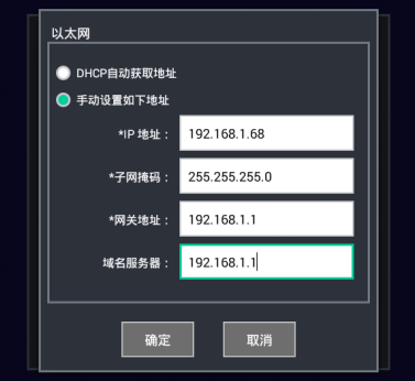 終端網絡配置可以選擇以太網、WiFi和移動網絡中的一種并配置相應的參數。以太網設置界面如下圖所示,可以選擇DHCP自動獲取地址(局域網中有DHCP服務器則建議使用)或者手動設置如下地址(局域網中午DHCP服務器或者不允許使用動態地址時使用)。