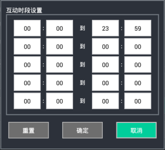 互動時段設置界面如下圖所示,最多可設置五個終端機的互動時段,00:00~00:00表示空配置項,00:00~23:59表示全天均可互動。終端機只有在配置的互動時段內才可以通過交互觸發互動節目的播放。