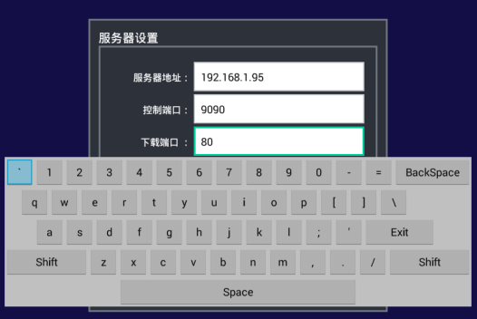 終端服務器設置中的服務器地址為終端需要連接到信息發布服務器電腦的IP地址(注:需要填寫電腦實際IP地址,請不要填127.0.0.1的地址)或者域名(域名前請不要添加http://前綴);控制端口為終端實時在線控制服務端口號如9090;下載端口為內容下載服務器端口號如80。控制端口和下載端口實際上是服務器端的配置參數,終端需要連接到服務器就必須和服務器的設置端口完全一致。