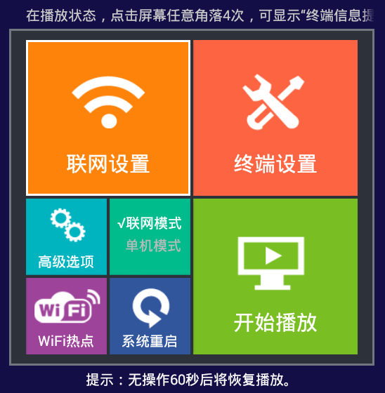 終端后臺設置界面包括7個子功能按鈕(注:若軟件界面有差異是因為未更新到最新版本,但不影響使用可以忽略):聯網設置、終端設置、高級選項、聯網/單機模式、WiFi熱點、系統重啟和開始播放。