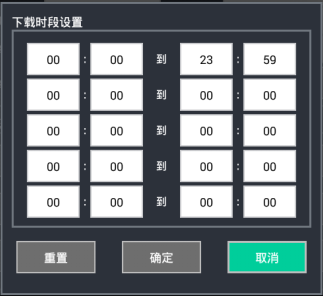下載時段設置界面如下圖所示,最多可設置五個終端機的下載時段,00:00~00:00表示空配置項,00:00~23:59表示全天均可下載。終端機只有在配置的下載時段內才會從服務器下載同步節目內容;而配置、程序和系統包的下載不受下載時間限制。