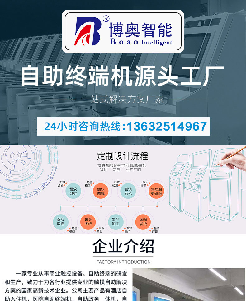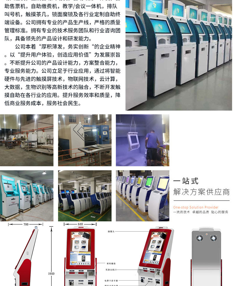 自助終端機定制:定制各種場景各種款式非標終端機;例如訪客機、景區自助取票機、醫院繳費查詢機、醫院自助取單機、社保查詢機、室內外廣告機、排隊叫號機、工控一體機、電力繳費查詢機、圖書自助銷售機、便攜式計算機、酒店自助入住機、自助收銀機等終端。
