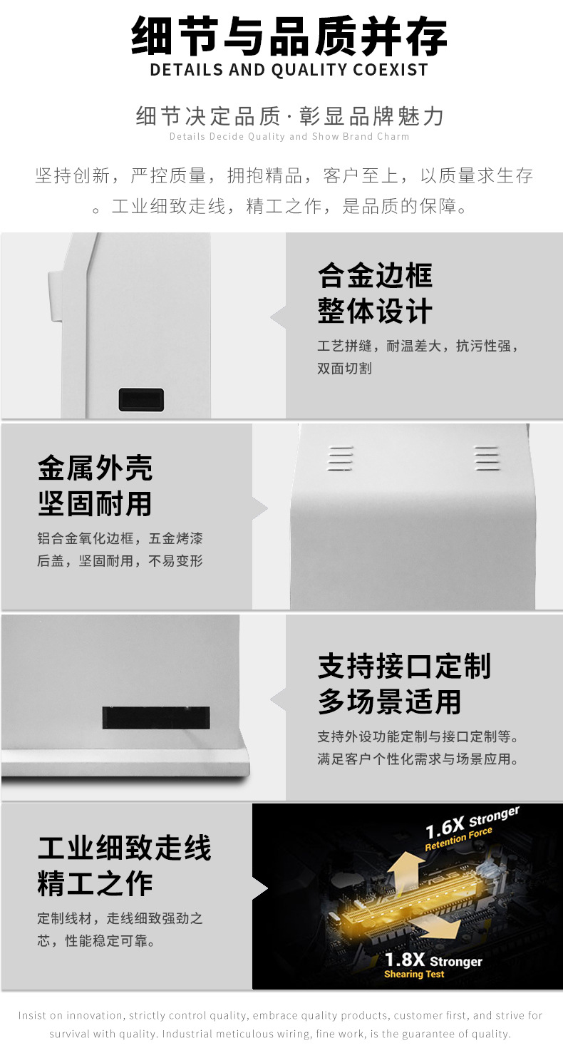 公司成產以“誠信、團結、務實、創新”的企業精神開拓市場、優化產品細節提供舒適的自助體驗。公司本著“誠信為本,質量至上”的取勝之道不斷開發自助終端在各行業的應用,打造方便快捷的一站式服務。