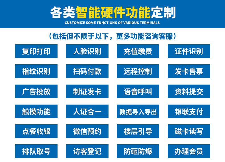 專業提供電腦觸控產品、自助服務終端的設計及生產服務,主要產品自助終端機、自助打印機、自助取票機、自助查詢機、自助繳費機、自助發卡機、自助政務一體機,產品使用于各個行業;醫院、學校、銀行、酒店、景區等。。。。。公司擁有專業的生產線,嚴格的質量把控。耐心的咨詢服務團隊及專業的技術負責團體。