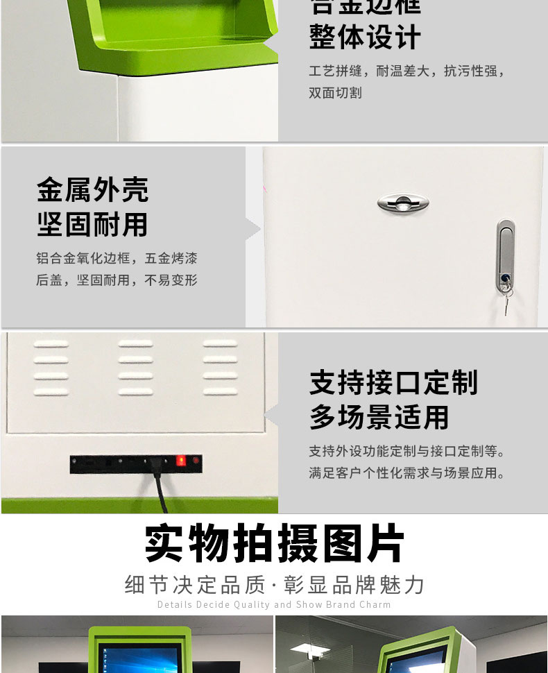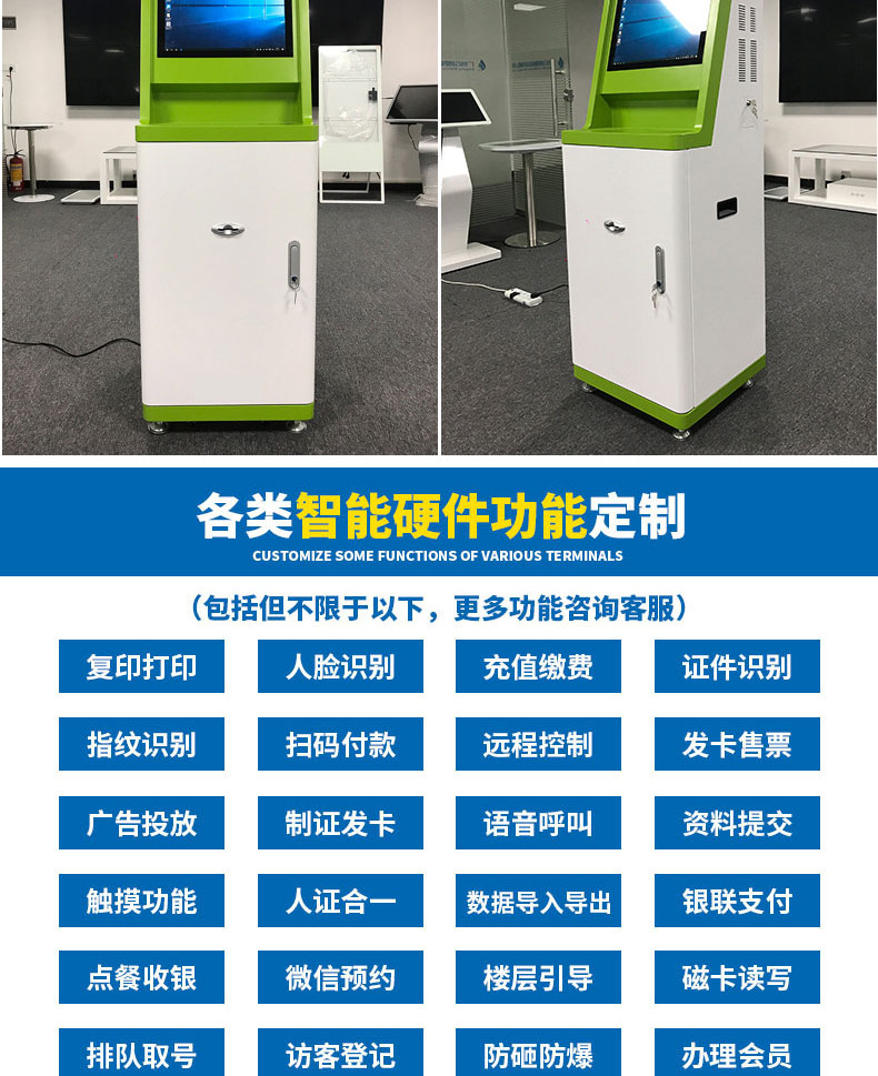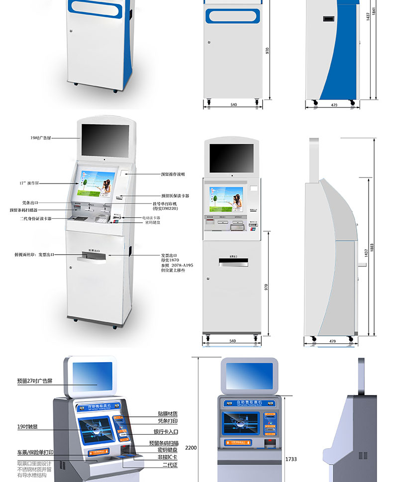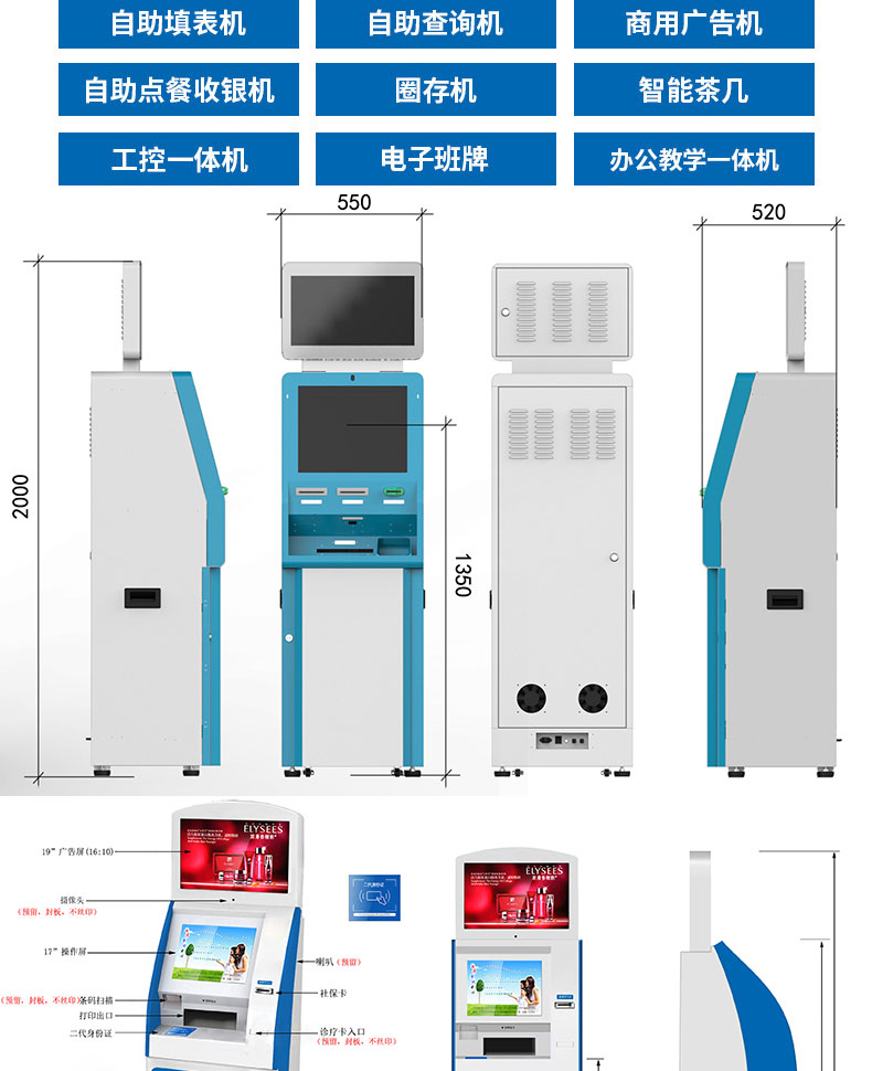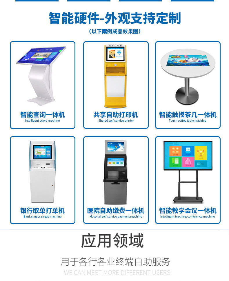 自助終端機定制:定制各種場景各種款式非標終端機;例如訪客機、景區(qū)自助取票機、醫(yī)院繳費查詢機、醫(yī)院自助取單機、社保查詢機、室內(nèi)外廣告機、排隊叫號機、工控一體機、電力繳費查詢機、圖書自助銷售機、便攜式計算機、酒店自助入住機、自助收銀機等終端。