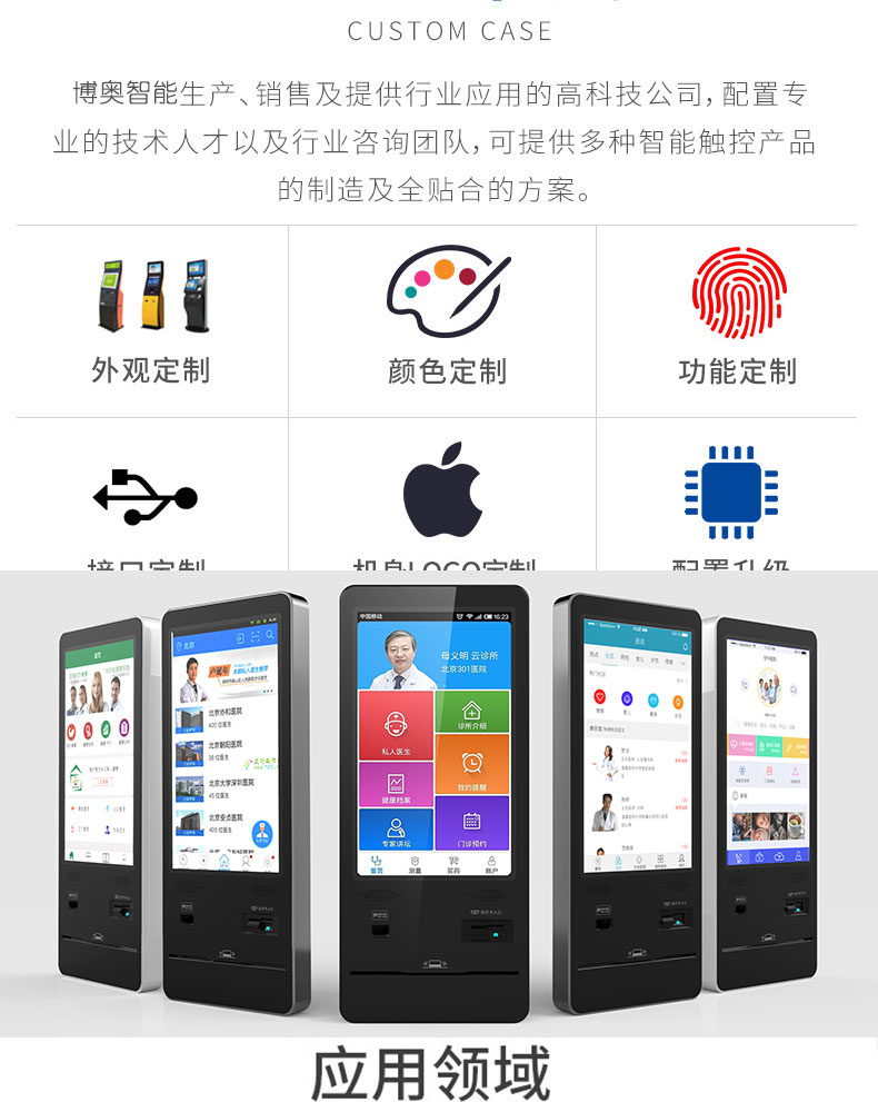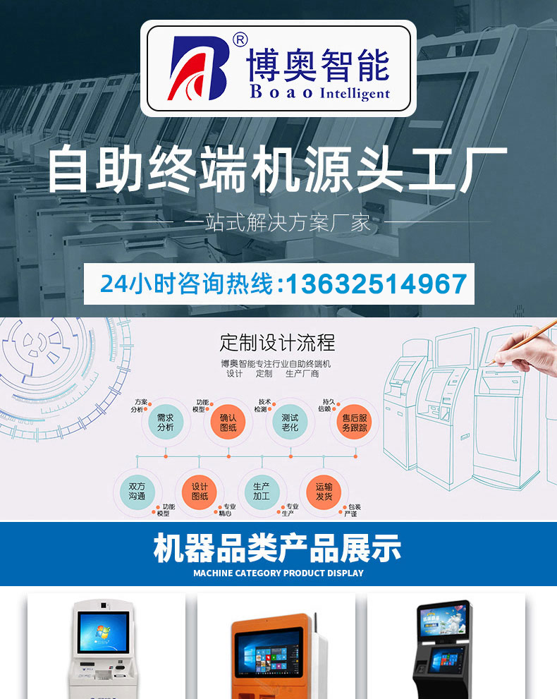 深圳市博奧智能科技有限公司專業提供自助終端機、觸摸查詢一體機、廣告機、液晶顯示器等產品的硬件、軟件研發與設計加工OEM/ODM等一站式服務;我們一直秉承以產品質量為核心、客戶至上、服務共贏為宗旨,為金融、醫療、教育、人工智能、政府工程項目、智慧城市、軌道交通、商業自助服務、廣告傳媒等行業提供質量過硬的產品和優質的服務。