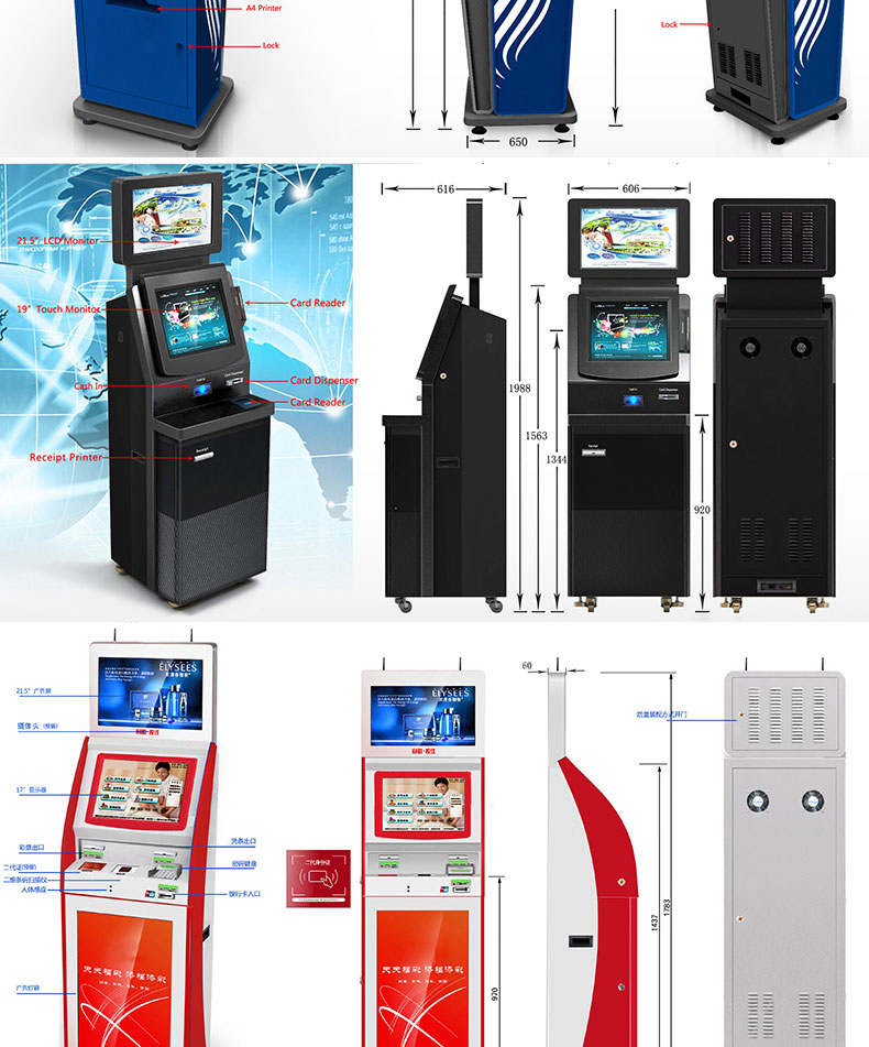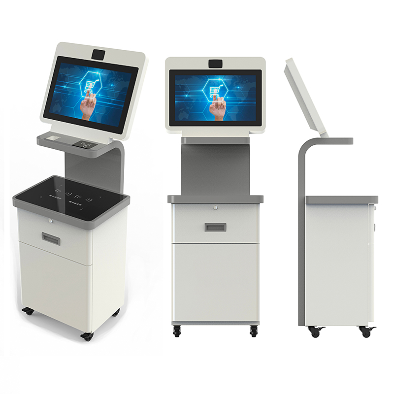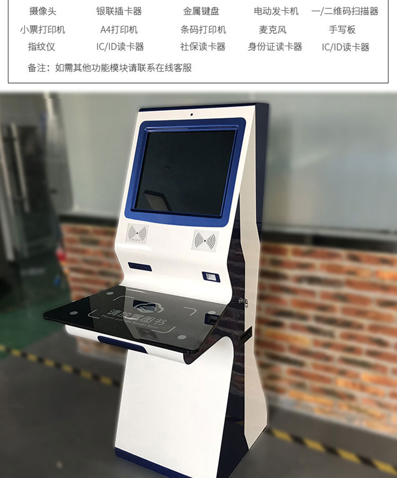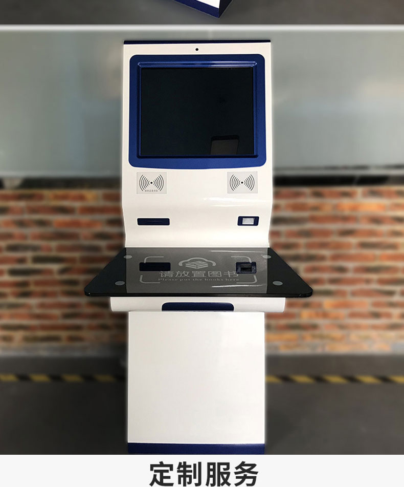 多功能自助終端一體機整機符合人體工程設計,機身大氣,外形精細、新穎、美觀、簡潔,觸顯一體操作、簡單方便,同時具有拓展性強的特點,可做為自助售書一體自助收銀一體機、檔案管理一體機、政務自助辦理終端、訪客登記一體機等,本設備支持Windows系統和Android系統,供客戶選擇,可根據客戶需求定制外觀和功能。