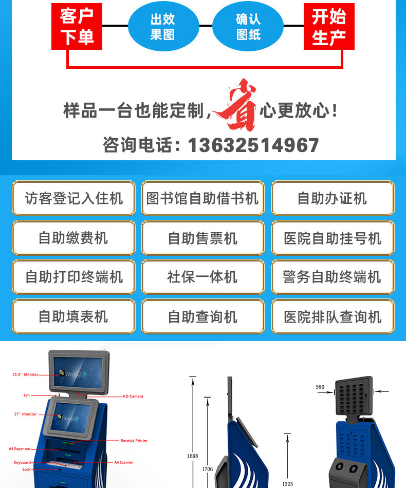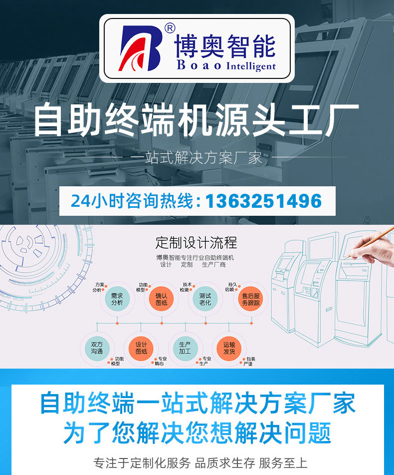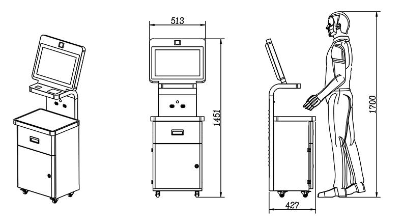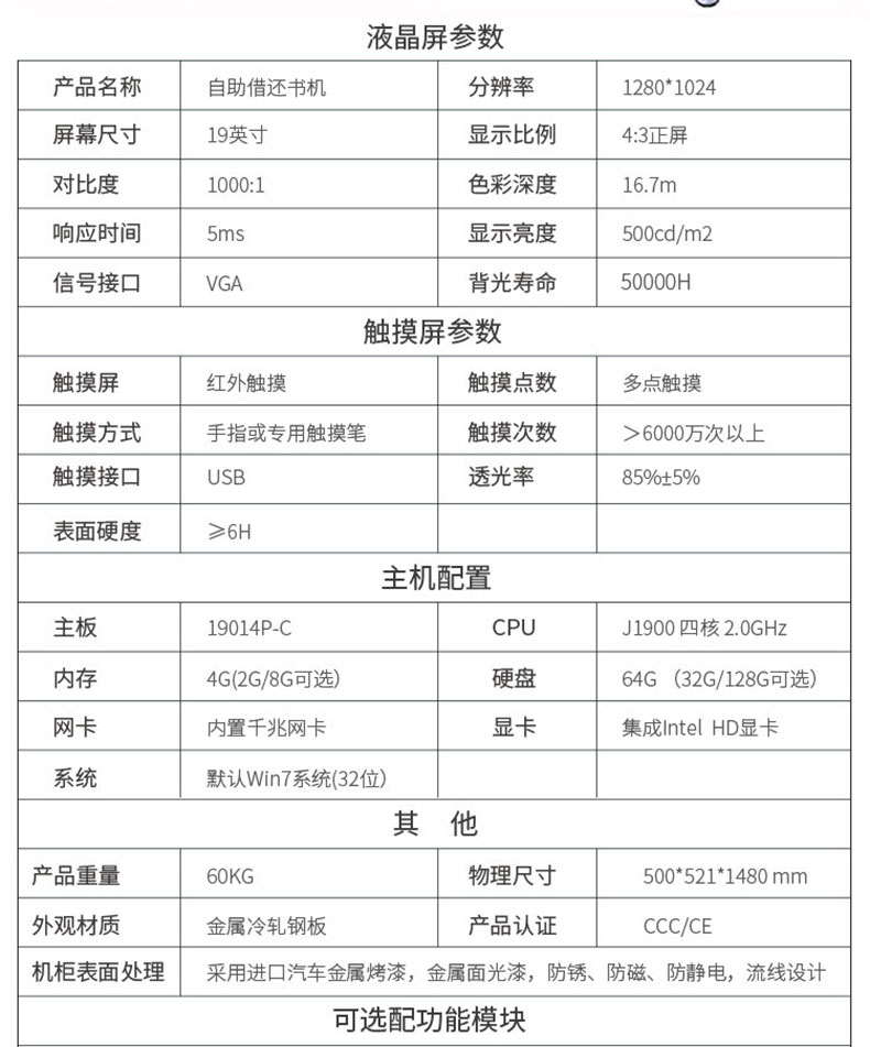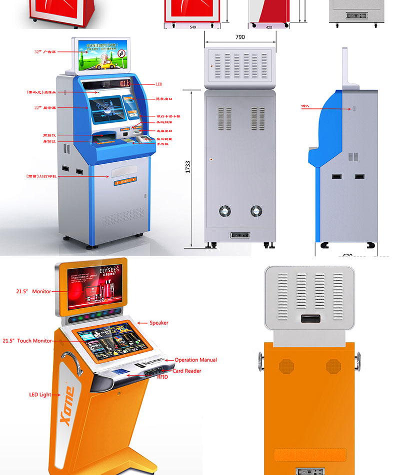 多功能自助終端一體機整機符合人體工程設計,機身大氣,外形精細、新穎、美觀、簡潔,觸顯一體操作、簡單方便,同時具有拓展性強的特點,可做為自助售書一體自助收銀一體機、檔案管理一體機、政務自助辦理終端、訪客登記一體機等,本設備支持Windows系統和Android系統,供客戶選擇,可根據客戶需求定制外觀和功能。