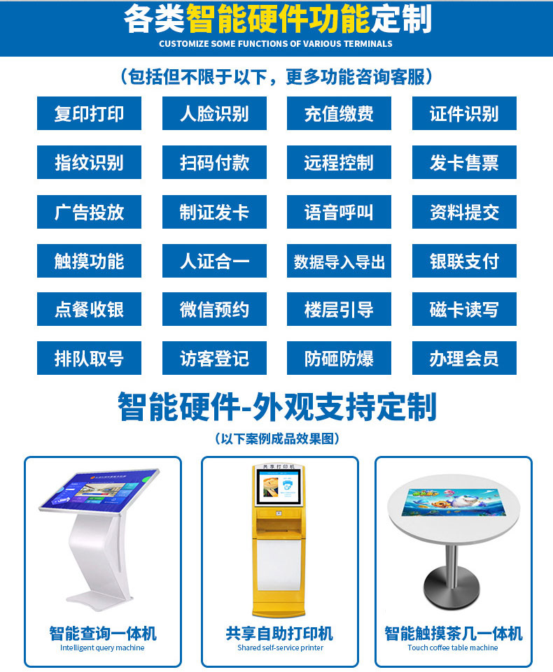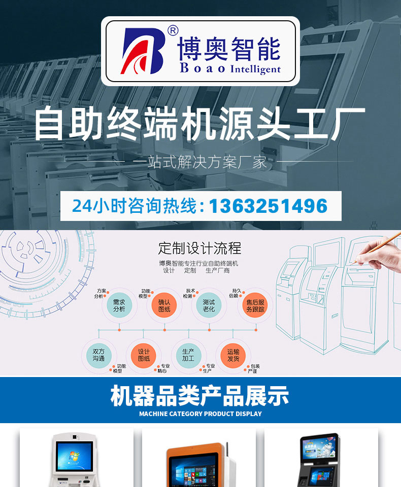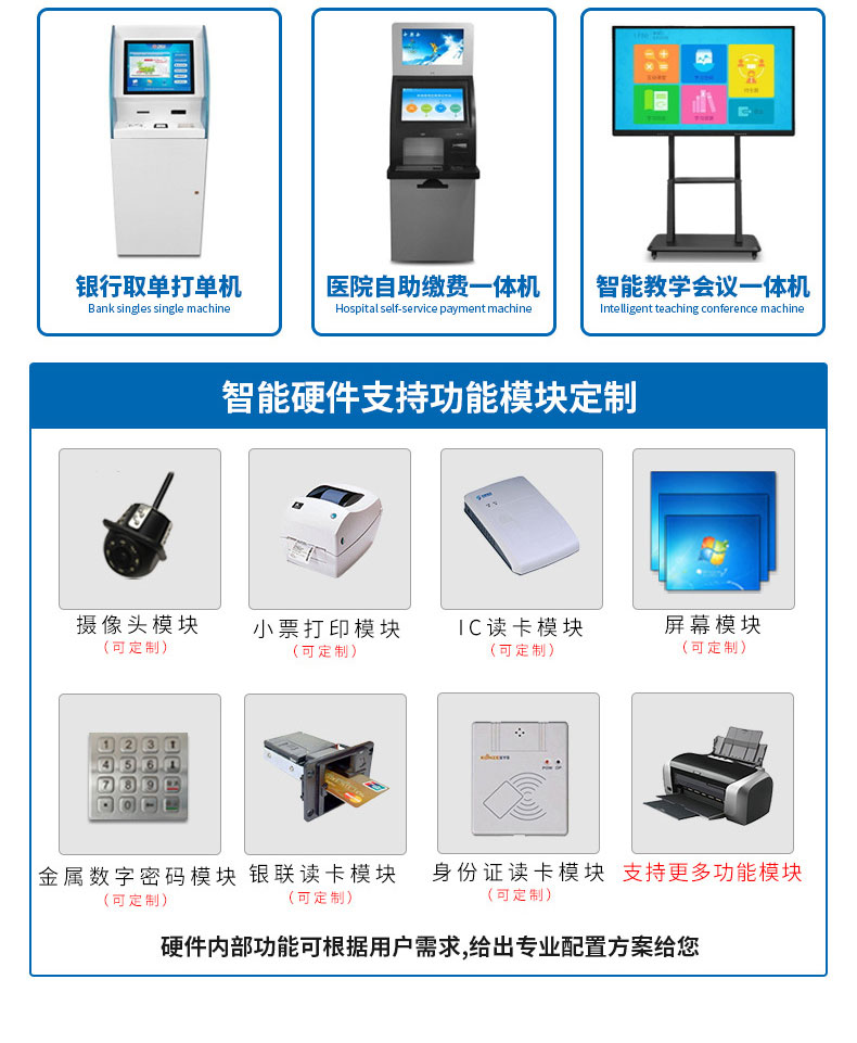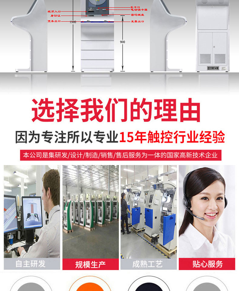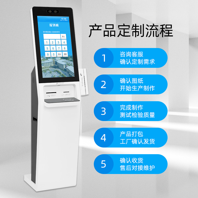專業提供電腦觸控產品、自助服務終端的設計及生產服務,主要產品自助終端機、自助打印機、自助取票機、自助查詢機、自助繳費機、自助發卡機、自助政務一體機,產品使用于各個行業;醫院、學校、銀行、酒店、景區等。。。。。公司擁有專業的生產線,嚴格的質量把控。耐心的咨詢服務團隊及專業的技術負責團體。