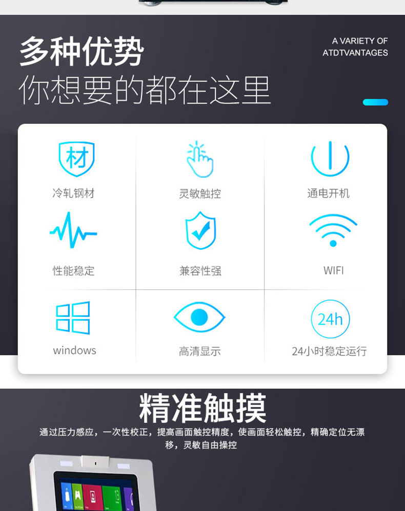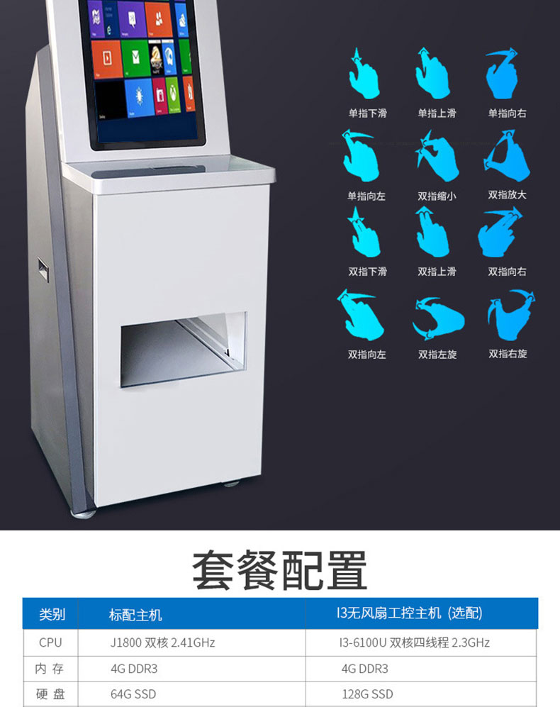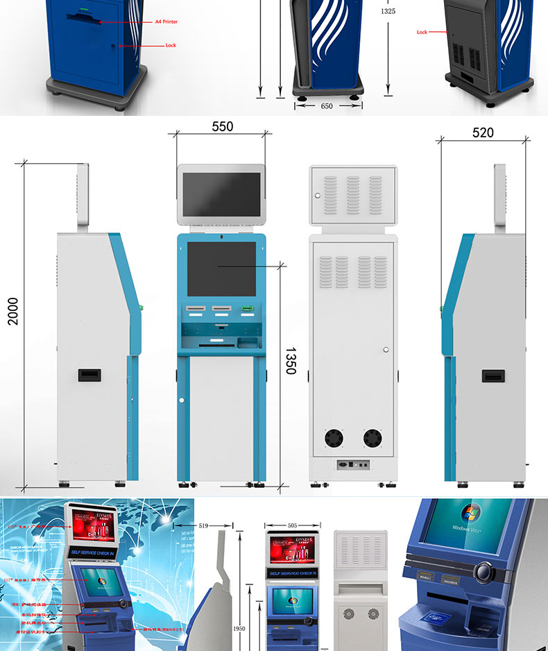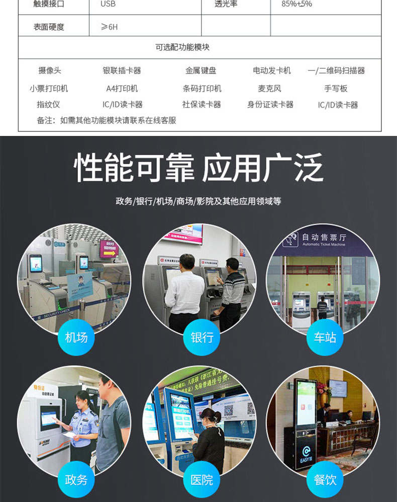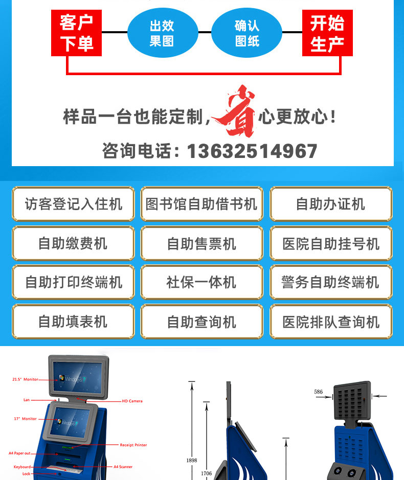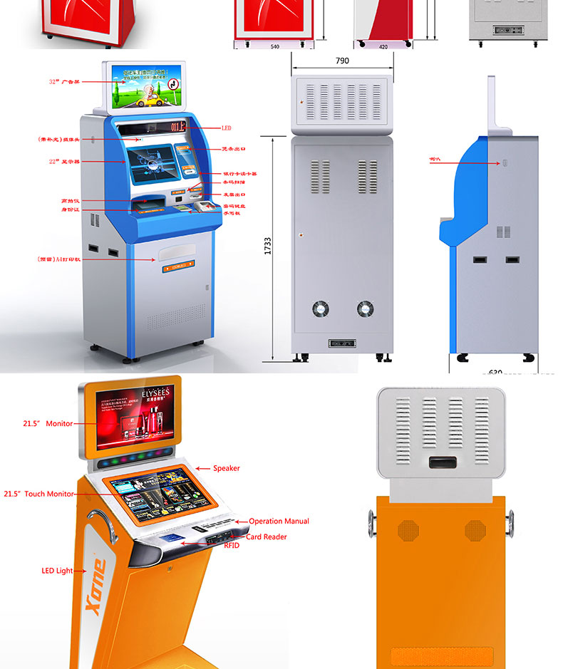自助終端機定制:定制各種場景各種款式非標終端機;例如訪客機、景區自助取票機、醫院繳費查詢機、醫院自助取單機、社保查詢機、室內外廣告機、排隊叫號機、工控一體機、電力繳費查詢機、圖書自助銷售機、便攜式計算機、酒店自助入住機、自助收銀機等終端。