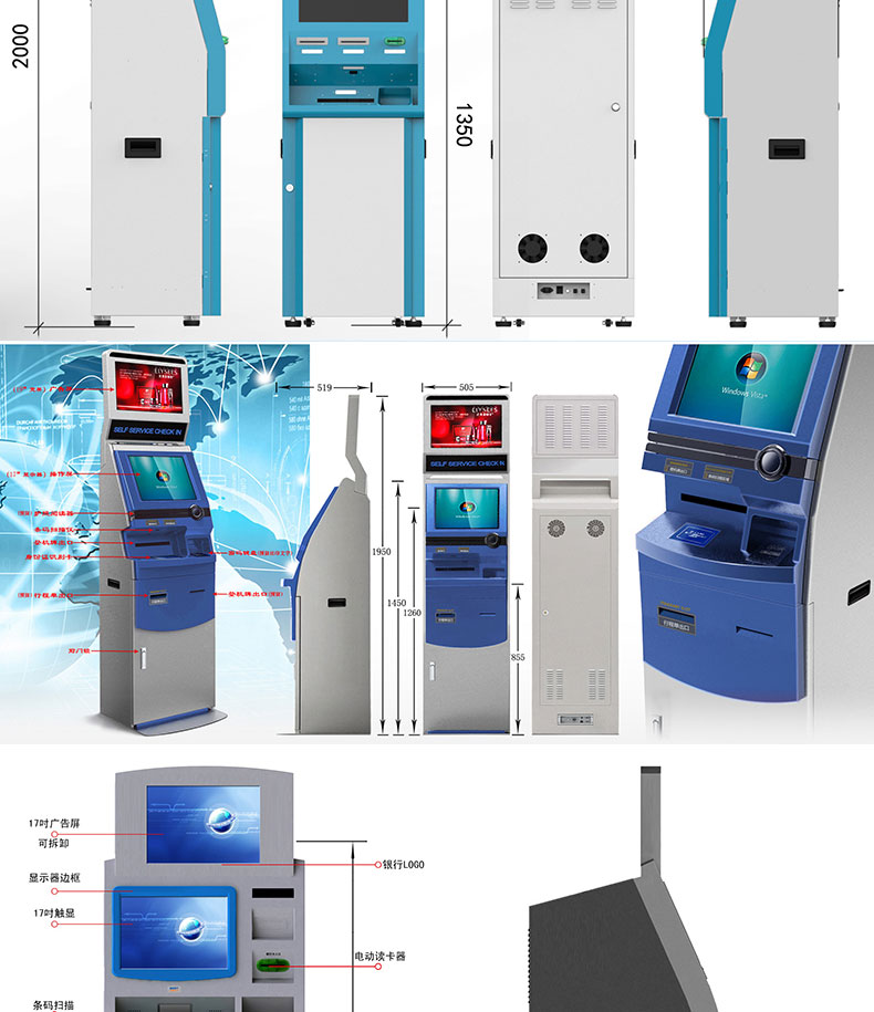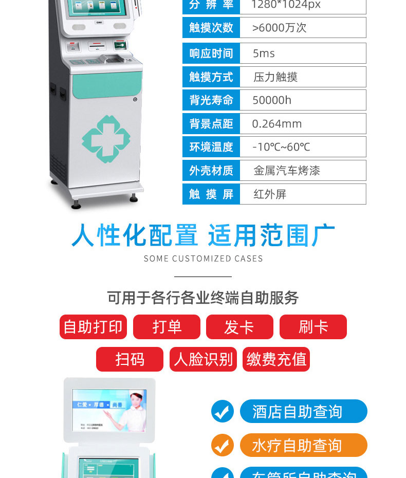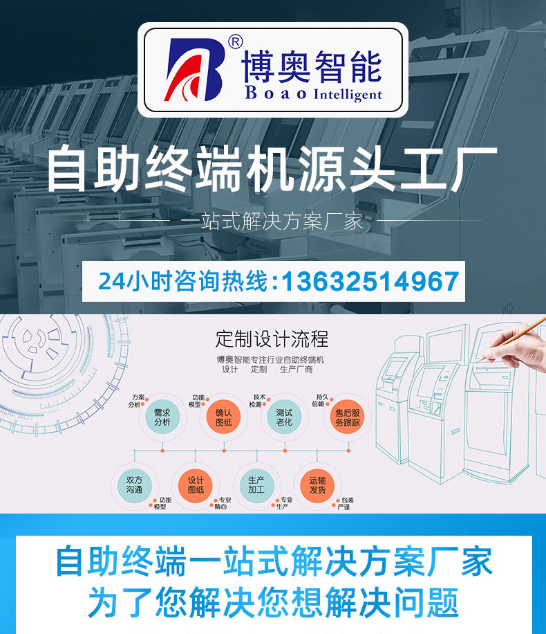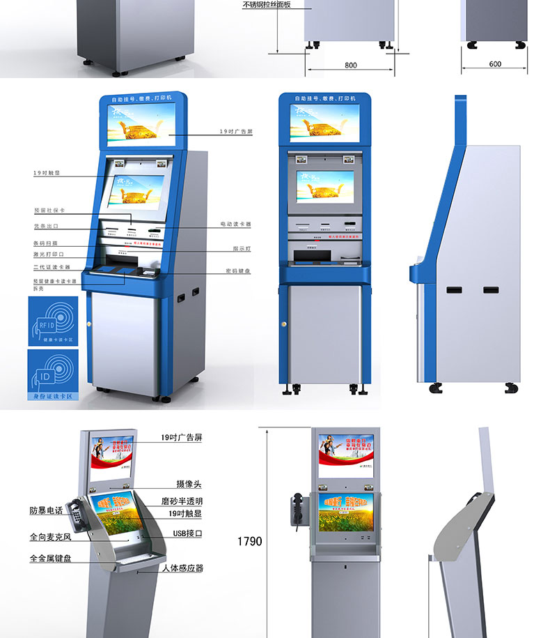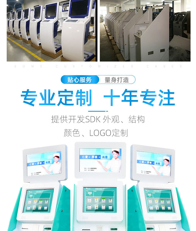 自助終端機定制:定制各種場景各種款式非標(biāo)終端機;例如訪客機、景區(qū)自助取票機、醫(yī)院繳費查詢機、醫(yī)院自助取單機、社保查詢機、室內(nèi)外廣告機、排隊叫號機、工控一體機、電力繳費查詢機、圖書自助銷售機、便攜式計算機、酒店自助入住機、自助收銀機等終端。