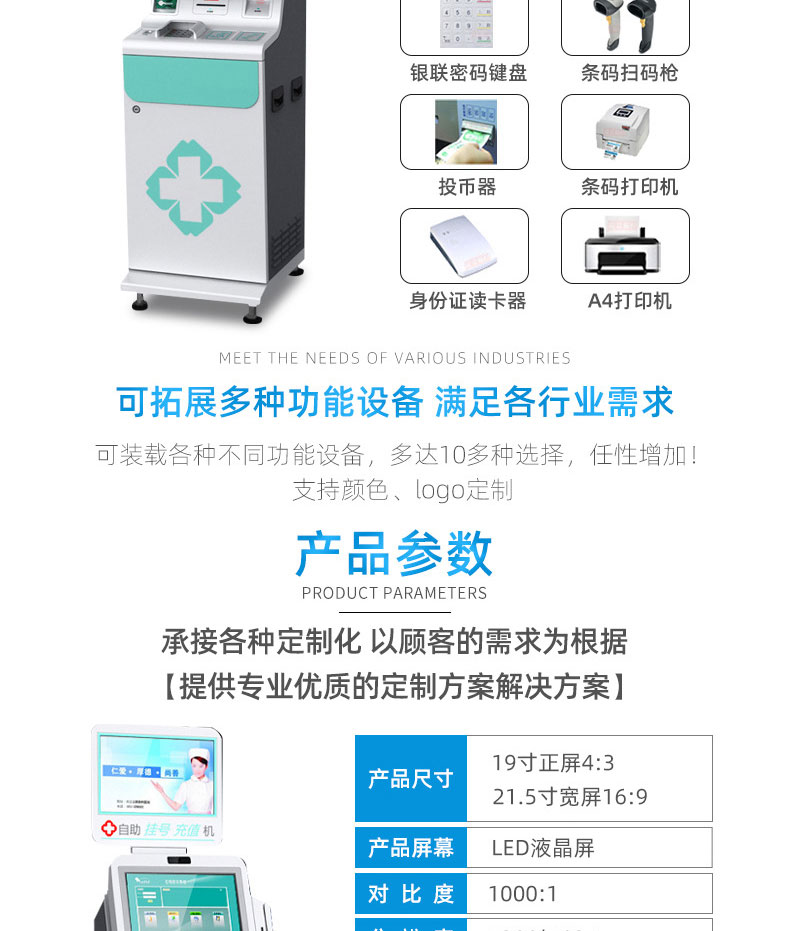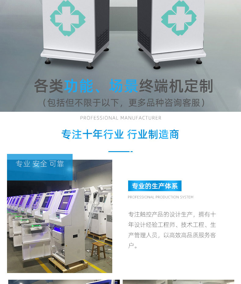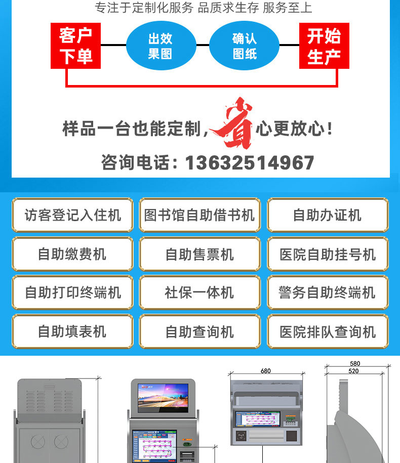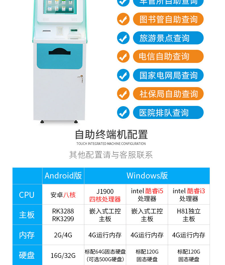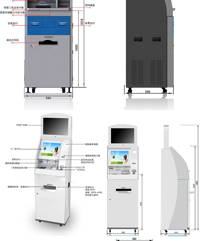 自助終端機定制:定制各種場景各種款式非標(biāo)終端機;例如訪客機、景區(qū)自助取票機、醫(yī)院繳費查詢機、醫(yī)院自助取單機、社保查詢機、室內(nèi)外廣告機、排隊叫號機、工控一體機、電力繳費查詢機、圖書自助銷售機、便攜式計算機、酒店自助入住機、自助收銀機等終端。